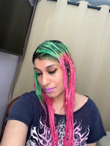 Your hair looks awesome! Love the pink with the green. Looks great on you.