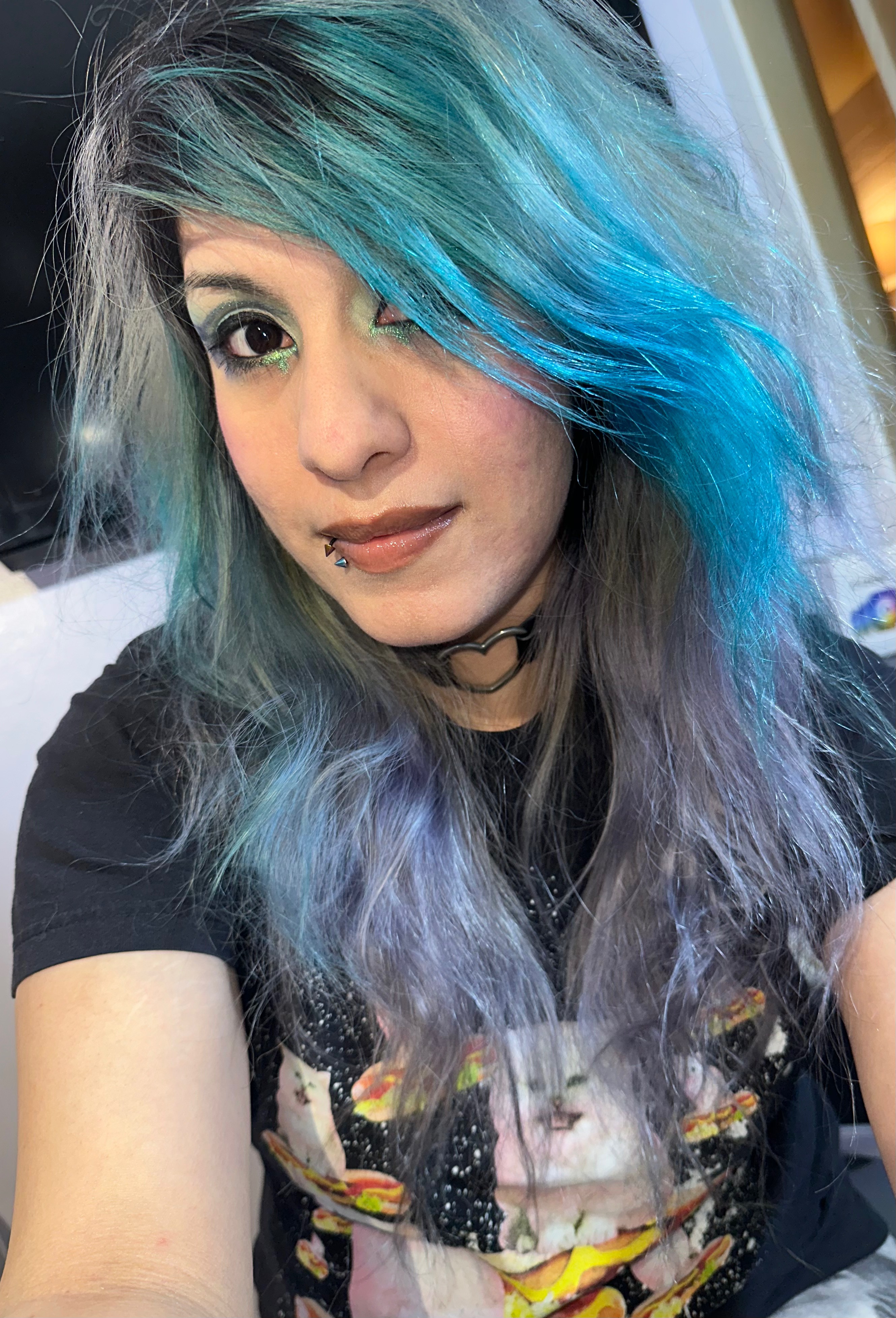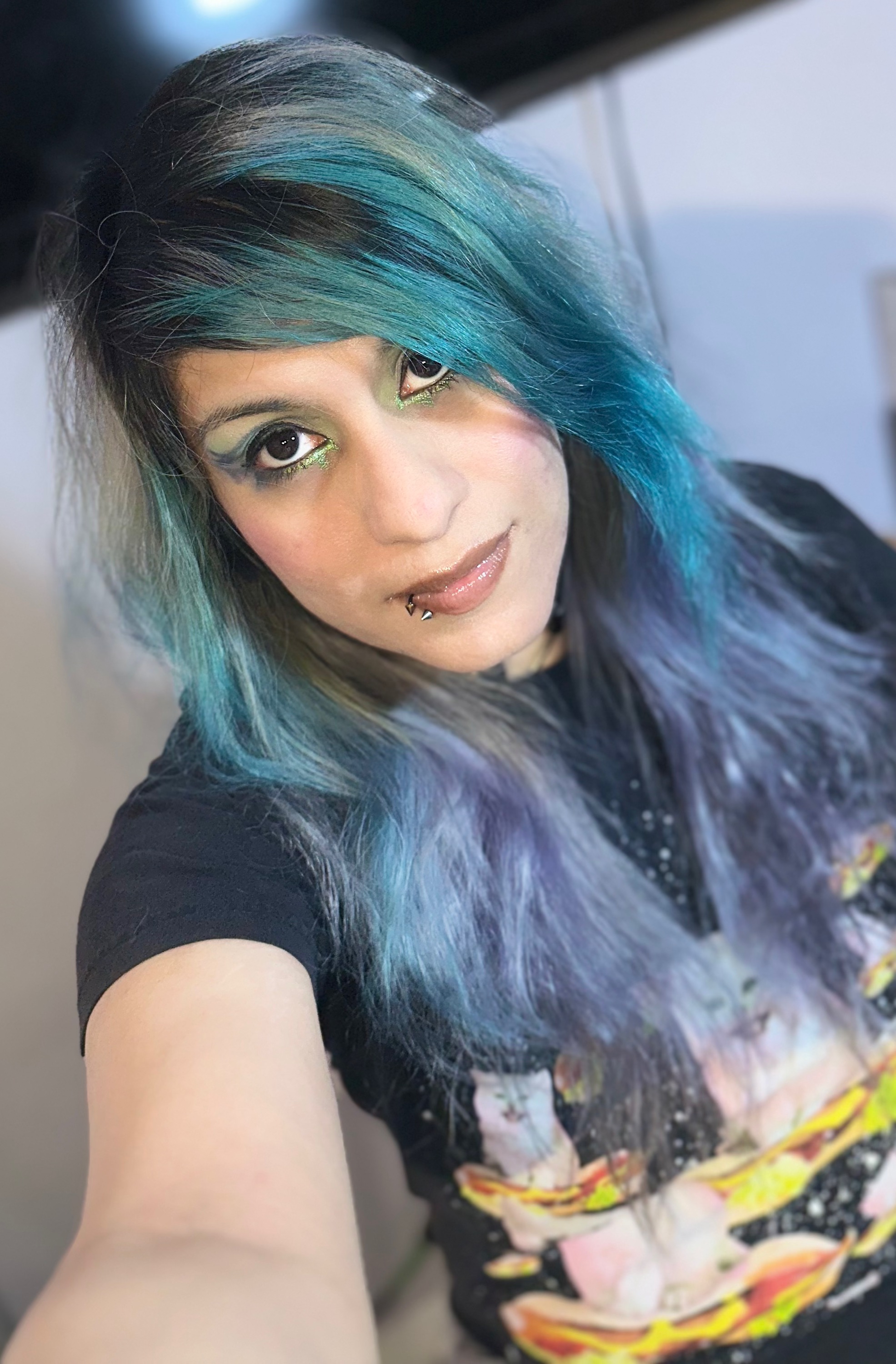 Also I redid my hair .  Well sort of , i just did the sides and bangs in Emerald Green , which is honestly more of a teal than and has more of a blue tint to it. but I really like it . I was considering Sea Witch or Cyan Sky from Lunar Tides but I’m really liking the teal so far. Also teal was the first color of hair dye I ever used . So returning to teal after all these years feels nice.