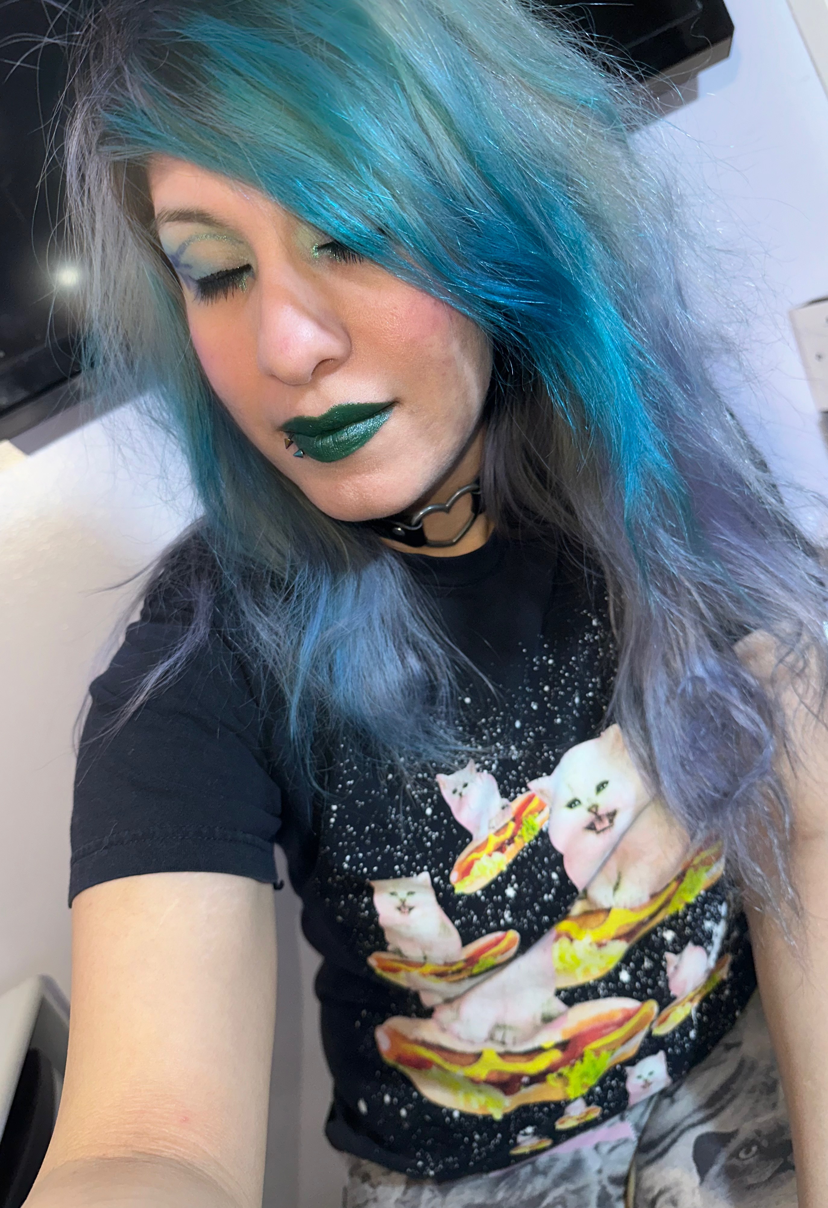 It’s honestly really nice ! I love how this lipstick feels , it reminds me of an old lipstick I got for Christmas. I was a teen and super experimental and a friend bought me a little drugstore leopard print makeup case filled with lipsticks. They were all kind of no name , but my two favorites were a purple/blue (blurple) and a green that was really similar this Lime Crime green. So it’s kind of fitting for me to be reunited with a green shade that I haven’t seen in a very long time.