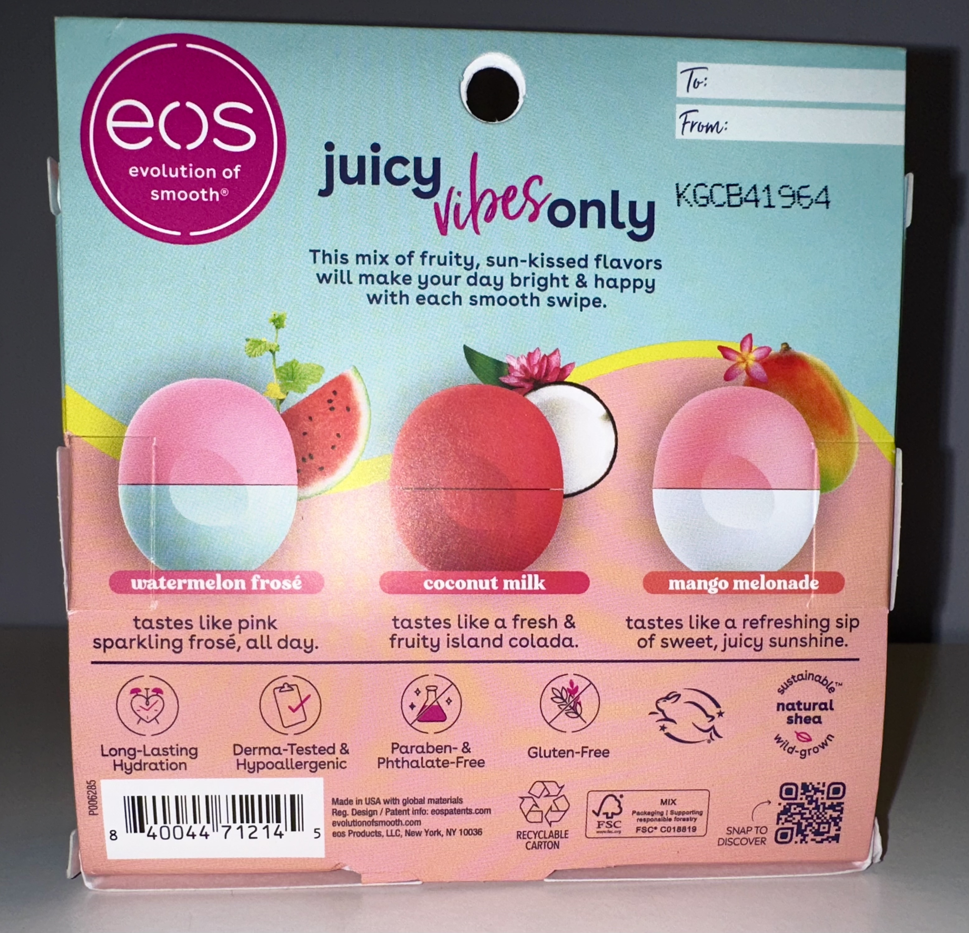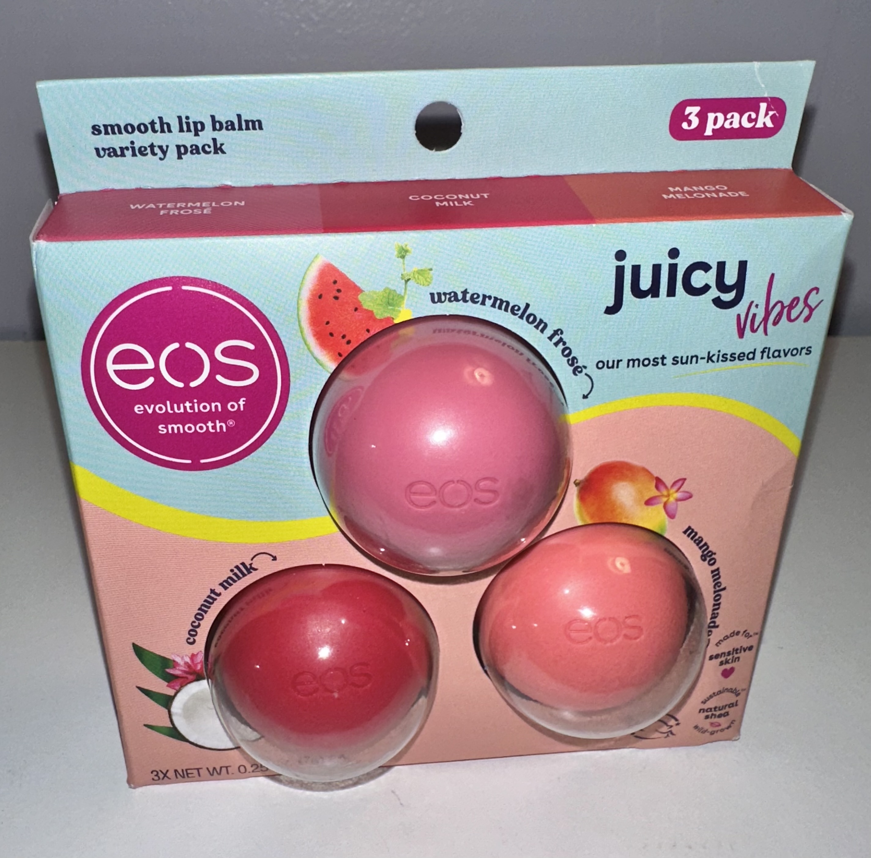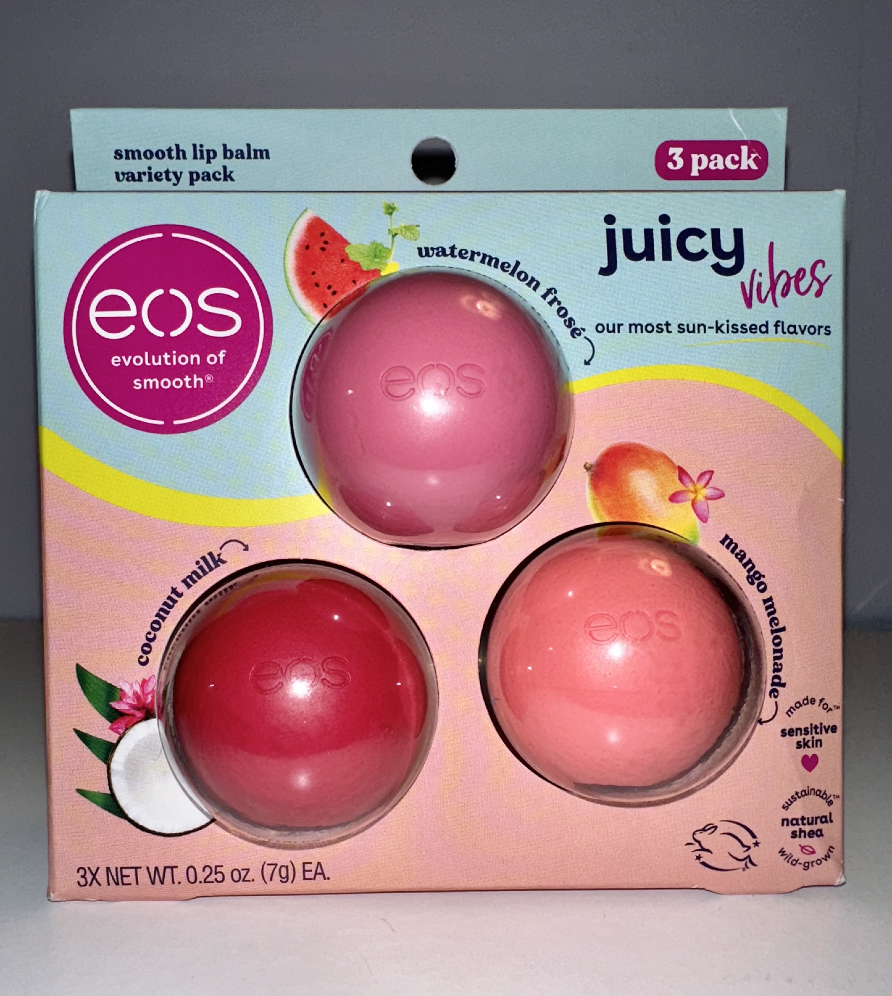 So looking back , I have tried the Watermelon Frosé and the Mango Melonade before . But those are honestly two of my favorites so I don’t mind trying them again . The third Coconut Milk I vaguely remember using and had to search my past blog posts to see if what I even said about it . Wait it was supposed to have a bit of a papaya scent too ? Definitely no papaya. But I kind of prefered the other pink and white striped version of the coconut milk balm . This one is nice and has the wonderful coconut tropical scent , but it does seem like it missing something . They should’ve added another tropical fruit like pinapple to it as well . My finace thinks it smells a little like playdough but I really didn’t notice playdough scent . Mostly coconut , with sort of a creamy note underneath. Also this one is a bit more waxy I’ve noticed compared to some of the other smoother EOS balms .