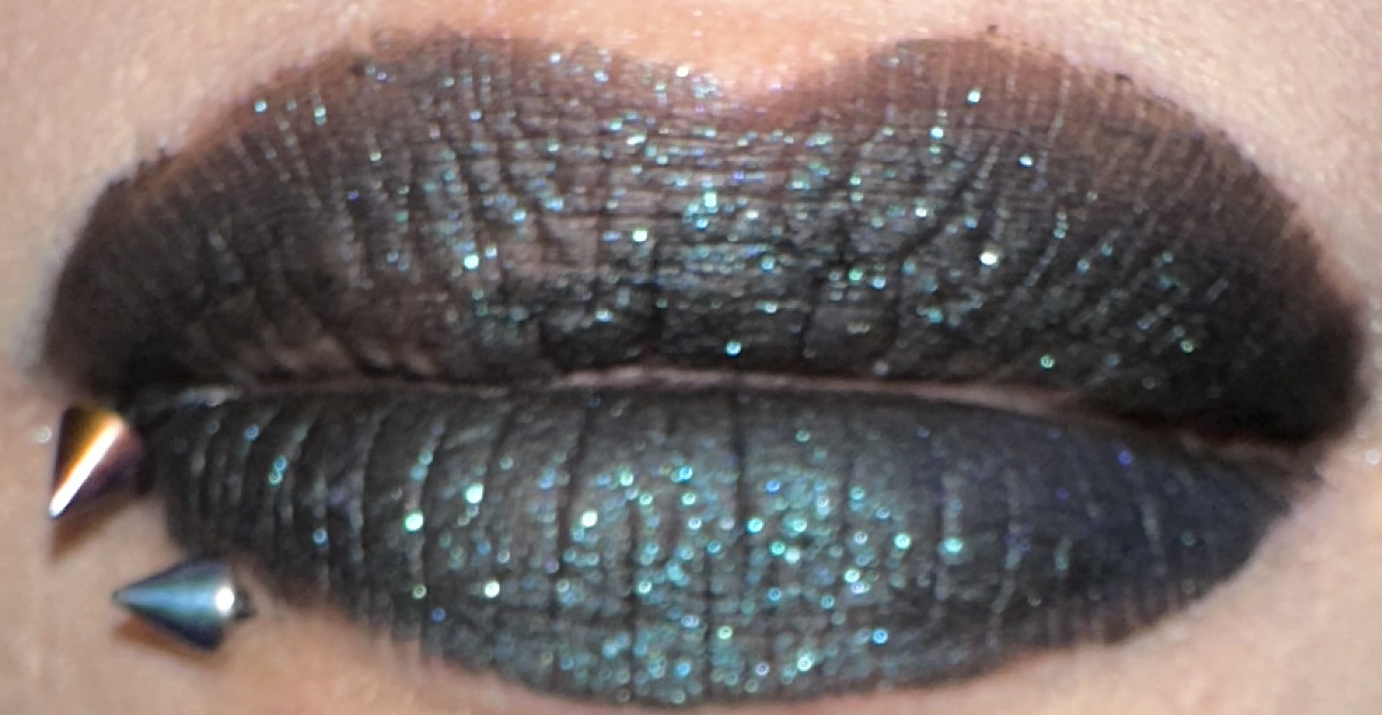 And now the swatch ! So when I ordered I thought it was closer to a lip stain or lip clay , but it’s actually kind of cream , that dries down to a matte . The blue shimmer is a bit grainy but not too bad and reflects cyan and a more purple toned blue. It’s also a cooler black shade as well. It’s scented as well , like rose oil , but it’s not too overpowering and goes away when on your lips. I’d like to add this is a lip product I would’ve screamed over as a teen goth/alt girl . It’s literally a lipstick from my dreams.