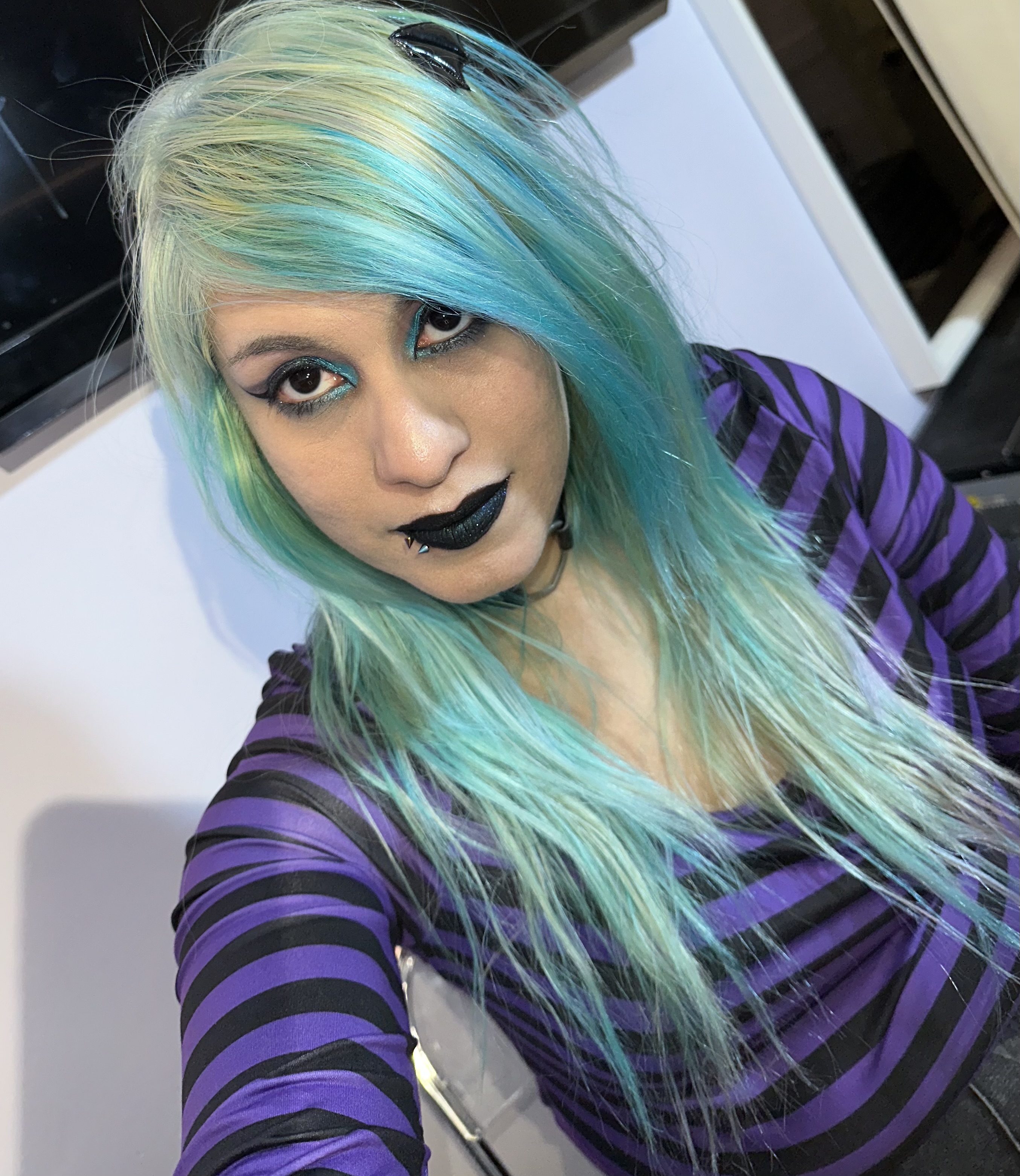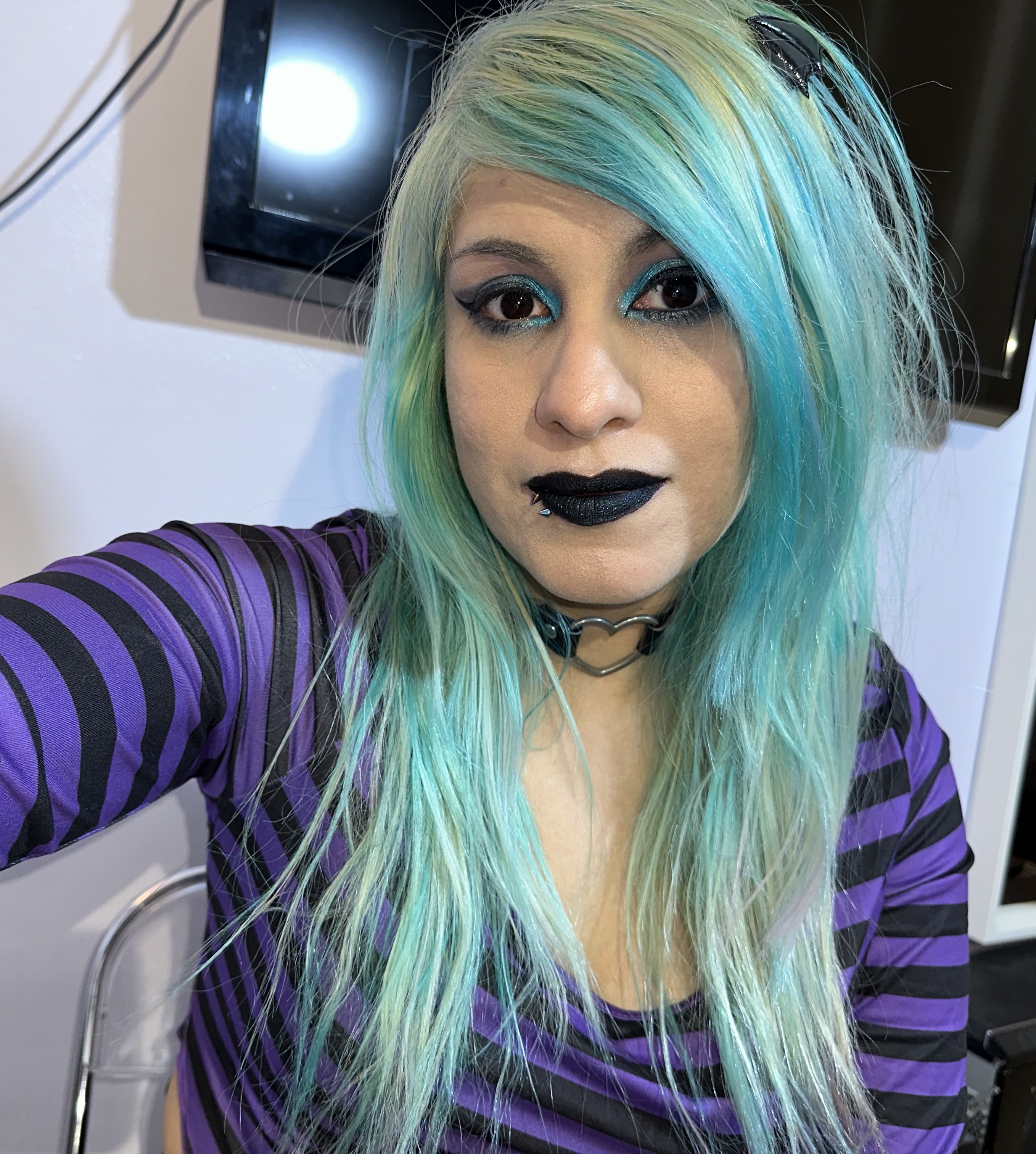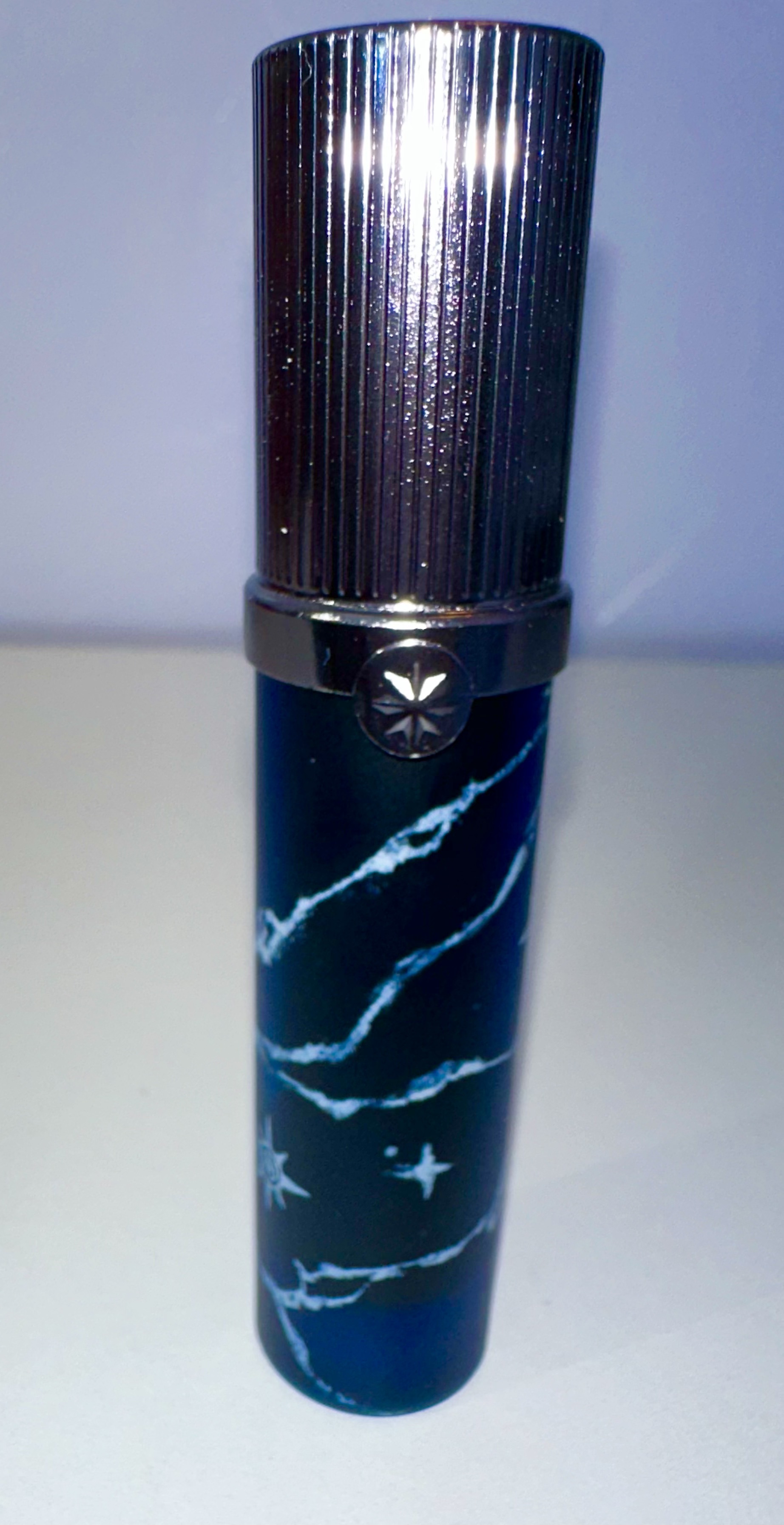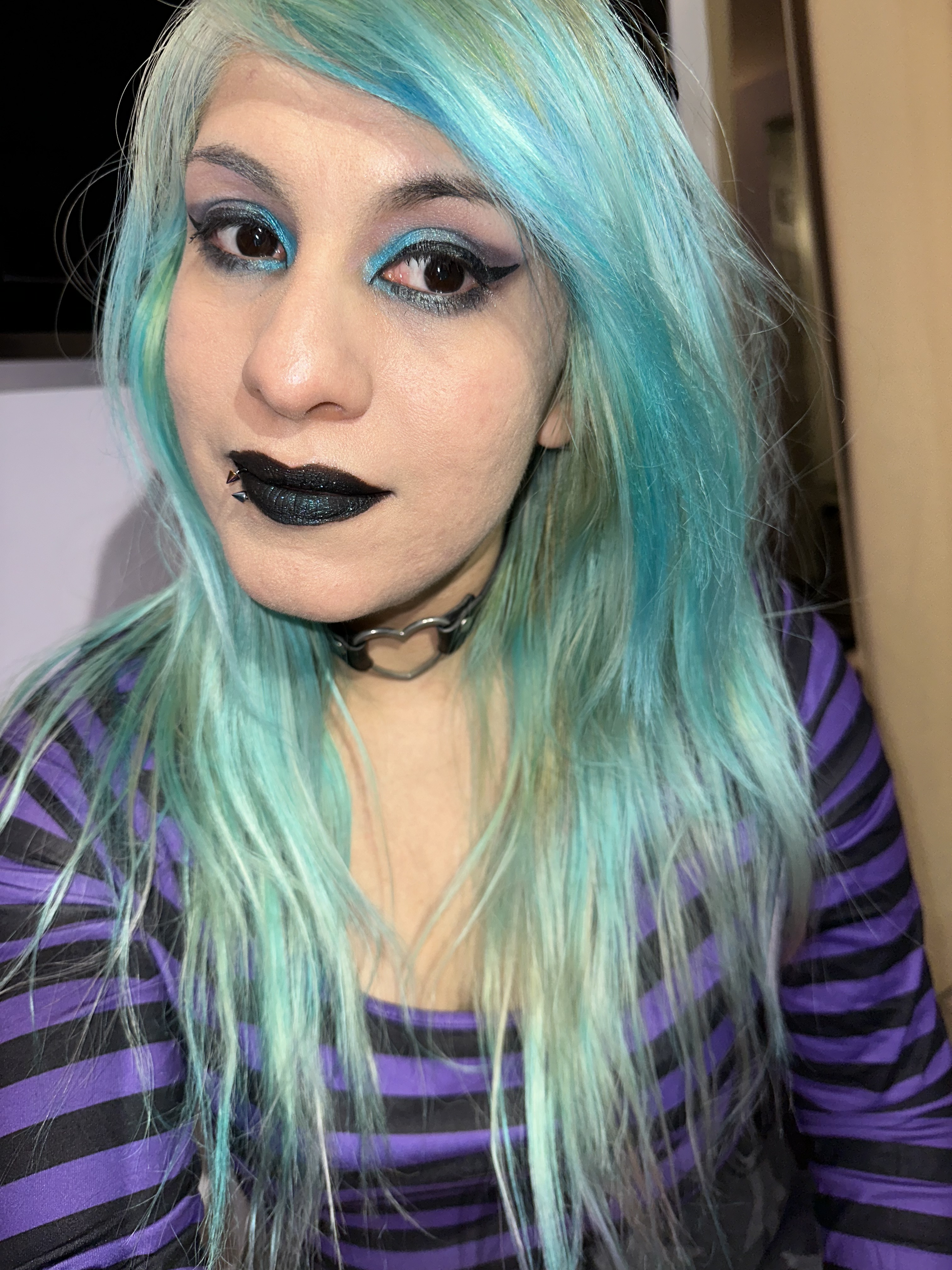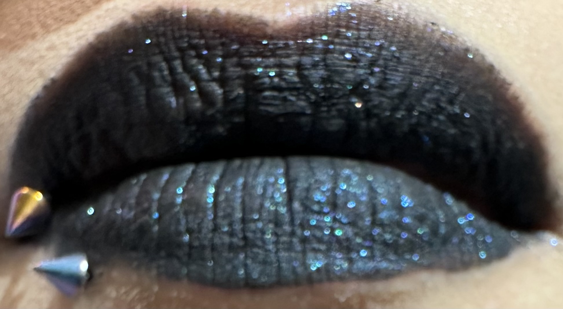 And now the swatch ! So when I ordered I thought it was closer to a lip stain or lip clay , but it’s actually kind of cream , that dries down to a matte . The blue shimmer is a bit grainy but not too bad and reflects cyan and a more purple toned blue. It’s also a cooler black shade as well. It’s scented as well , like rose oil , but it’s not too overpowering and goes away when on your lips. I’d like to add this is a lip product I would’ve screamed over as a teen goth/alt girl . It’s literally a lipstick from my dreams.