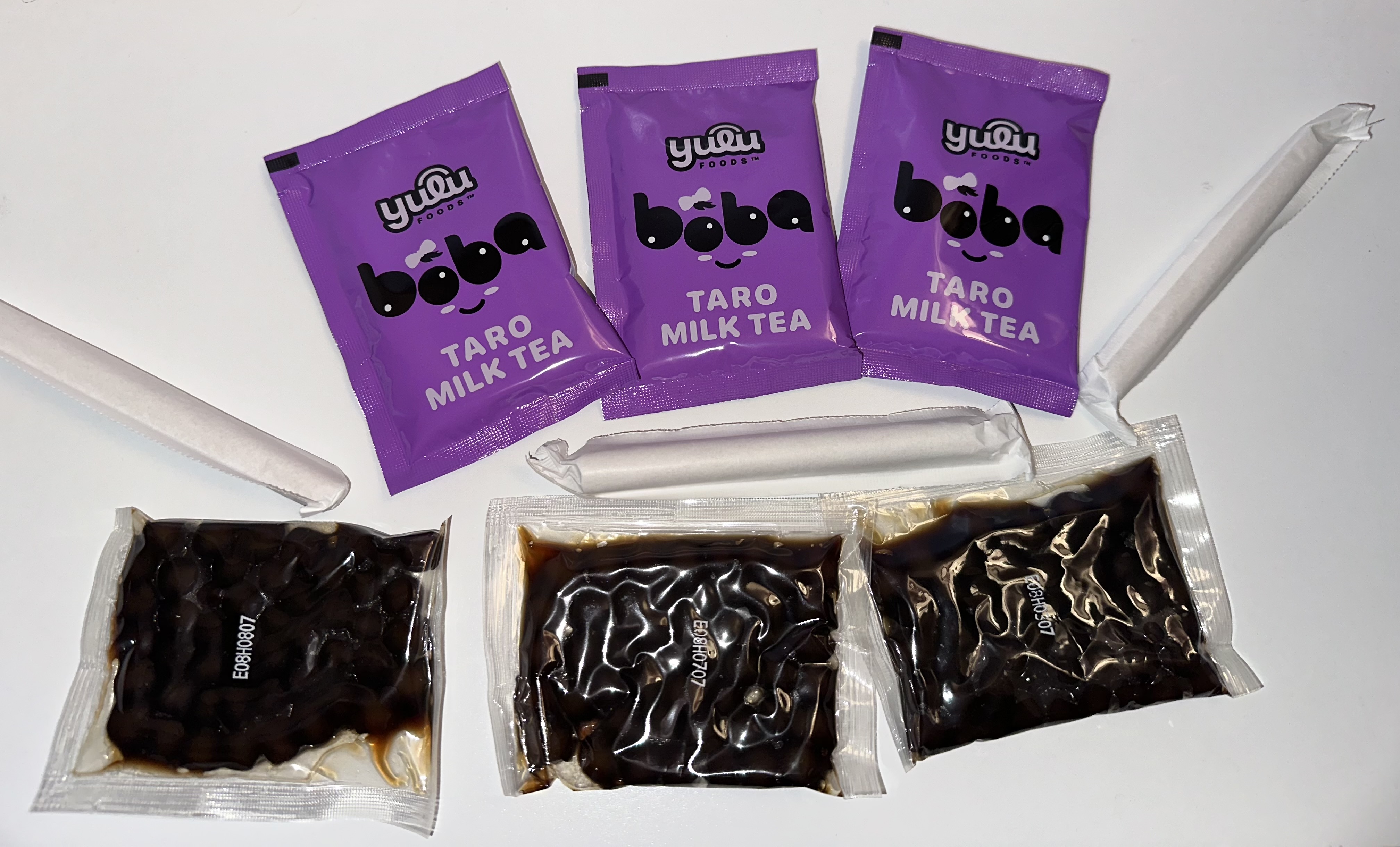The straws i though were super short but they actually pull out and can be a little longer . Which is kind of cool , also you boil these boba in water in their package rather than just straight microwaving them . The tea powder itself is very sweet and while similar to the J-way taro tea , it’s not as rich in flavor . I do wish my store wouldn’t just stop carrying products , but at least these kits are still good. The boba pearls themselves are very sweet and brown sugar flavored , and have a nice chewiness to them.