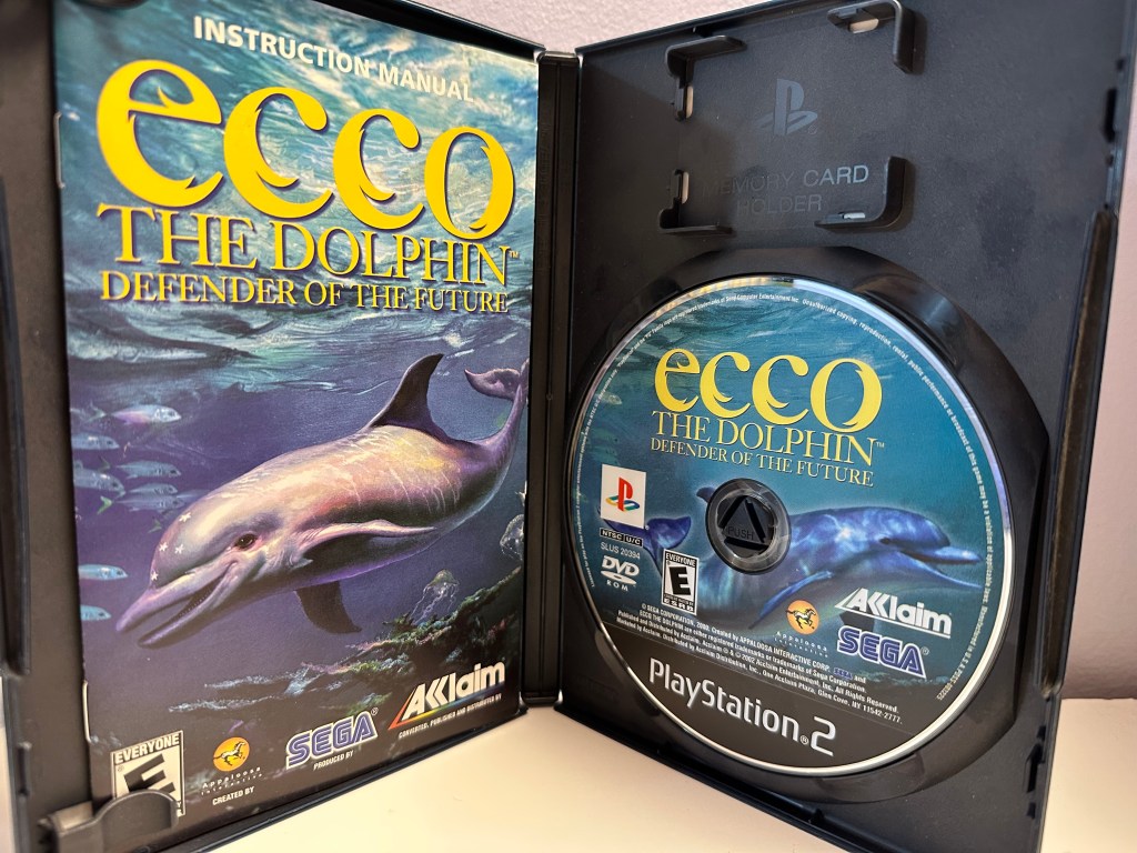 Here’s The first Ecco game that I actually owned! This was a Christmas gift from my sister , as she also loves dolphins and knew I liked playing original Ecco. this was one of my favorite games to play on the PS2 , as it was so different that a lot of the other games that I played at the time. It was 3 dimensional underwater movement, you had to learn special songs , that helped you solve puzzles or talk to marine life. It’s one of the most beautiful games that I’ve ever played on the Ps2 and maybe one of the most visually pretty underwater games. There’s sharks , jellyfish, orcas , turtles , you can actually skip on the surface of the water and leap up in the sky , dive underwater into secret caves . there’s even special dolphin combat . It’s also pretty hard , and you can die fairly easy. I think I got super far ( at least in the middle of the game) with a GameShark . But I still couldn’t finish the game. I did watch a YouTube video that showed the levels and the plot .