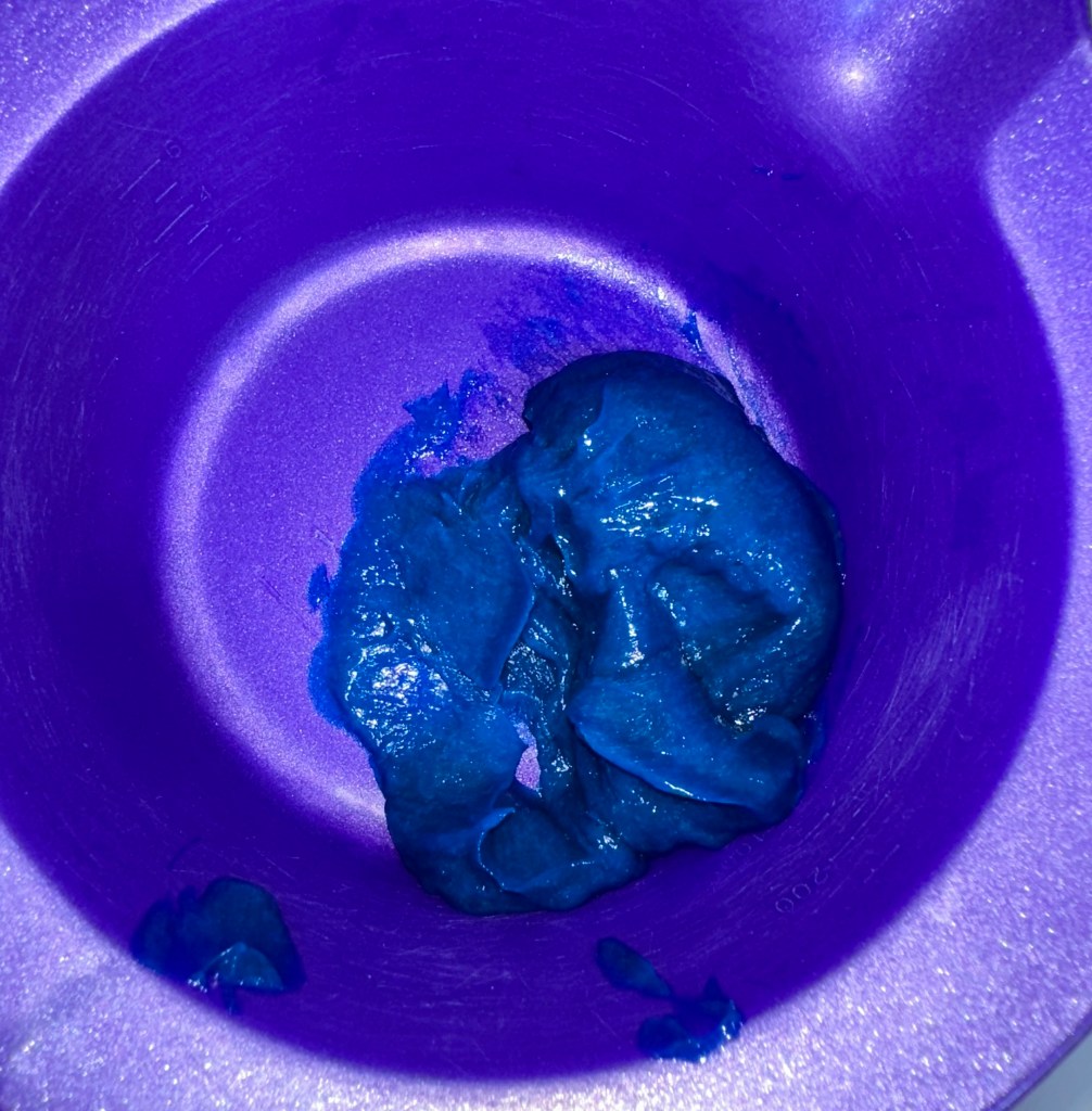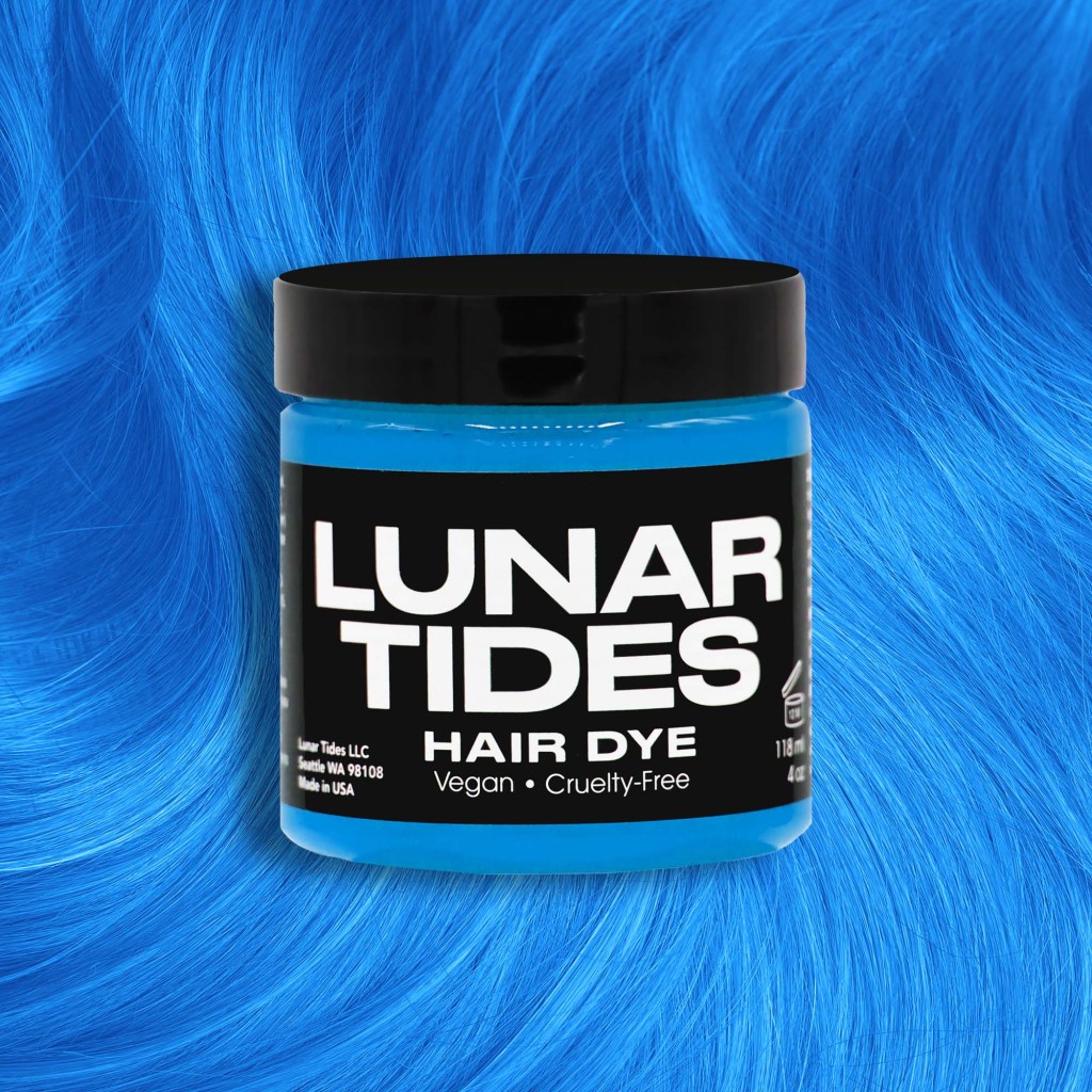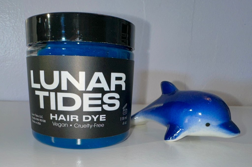 Lunar Tides smells really good too, a bit like fruit snacks or some type of fruity candy. I’ve reviewed a few other shades ,moonstone , smokey navy,iris purple, And blood moon. They all smell about the same and while they don’t last quite as long as Iroiro’s, Lime Crime or One n Only they do fade nice and I appreciate having a spectrum of colors rather than just one or two blue, purple or green shades. The consistency is a bit of a mix of gel and pudding . But it’s still easy enough to spread though my hair. If you have even longer of thicker hair I would suggest buying two jars to totally cover your head.