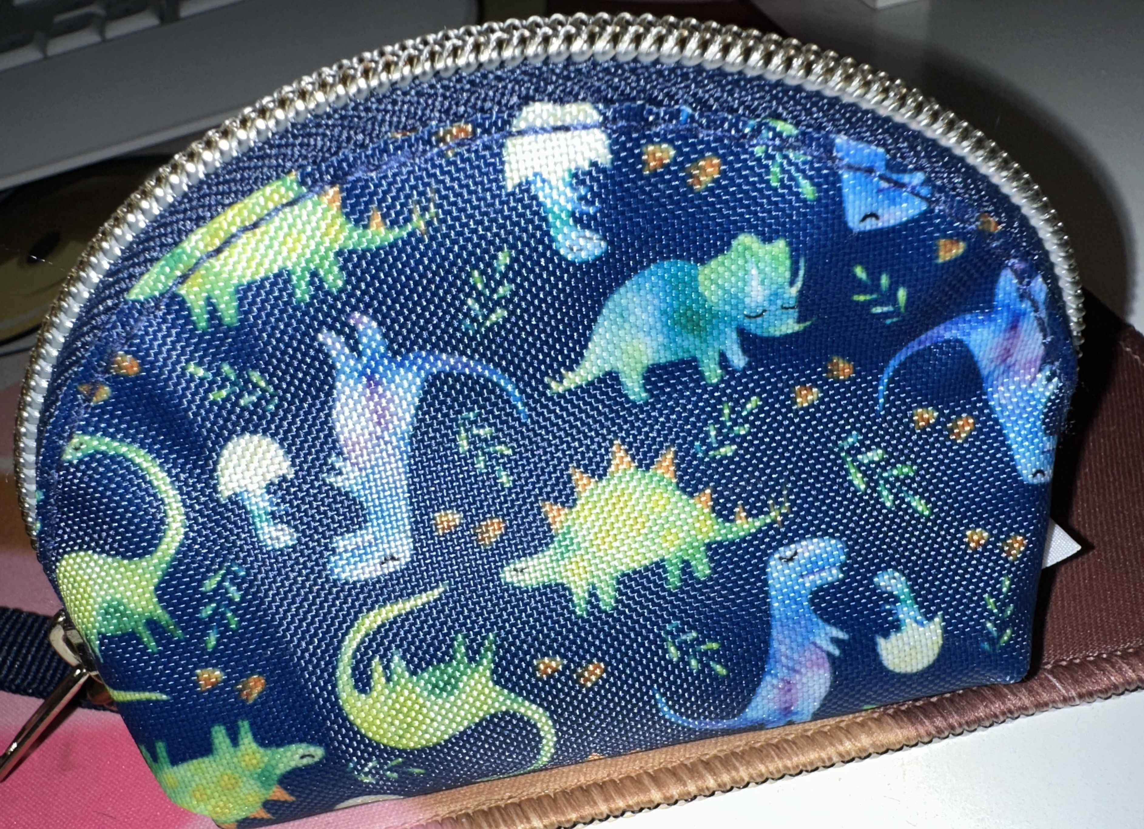 It worked ! I have a feeling I’ll be buying more ! Also sadly this will be the last time I’ll be wearing Sugarpill’s Vertigo liquid lipstick, it finally dried out and to add even more insult to injury the little doefoot brush broke off and fell into the tube. Well it was a good couple of years wearing it. At least I have a tiny bit of Zero leftover , although I may have to order more of that too. It’s still one of my favorite black lip sticks . Which also reminds me , I sort of misplaced my newest Girlcult black and blue lipstick , I dug everywhere and did eventually find , but it really freaked me out. It’s my newest favorite lipstick and I would nhate to lose and have it dry up. My guy being a sweetie thought it would be a good idea to keep it in this mini dino bag.