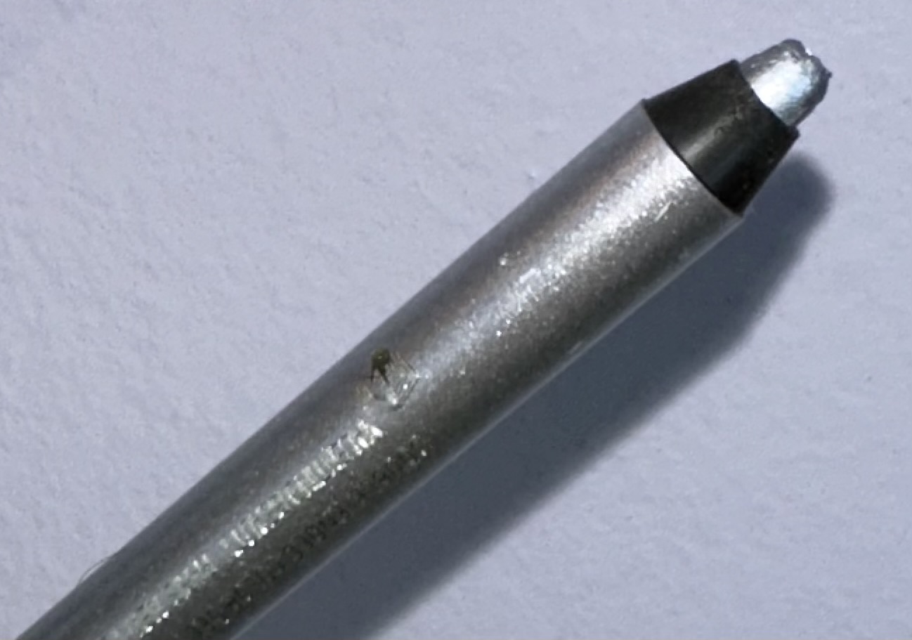 It’s a really nice metallic white silver , the actual crayon part is pretty soft , so glides on easy without tugging but can break off if you press too hard . There is a bit of sparkle though . I sadly couldn’t get my camera to focus so my other picture was sort of blurry mess. Another cool feature with this pencil is the brush on the other end . It’s for blending out the liner , but honestly this liner did not budge , so I think you could just use it with some other eye makeup instead. The liner is mostly waterproof , but can rinse off with water if you don’t have any oil or makeup remover wipes . But as for general wear time , it stays on the eyes for hours .