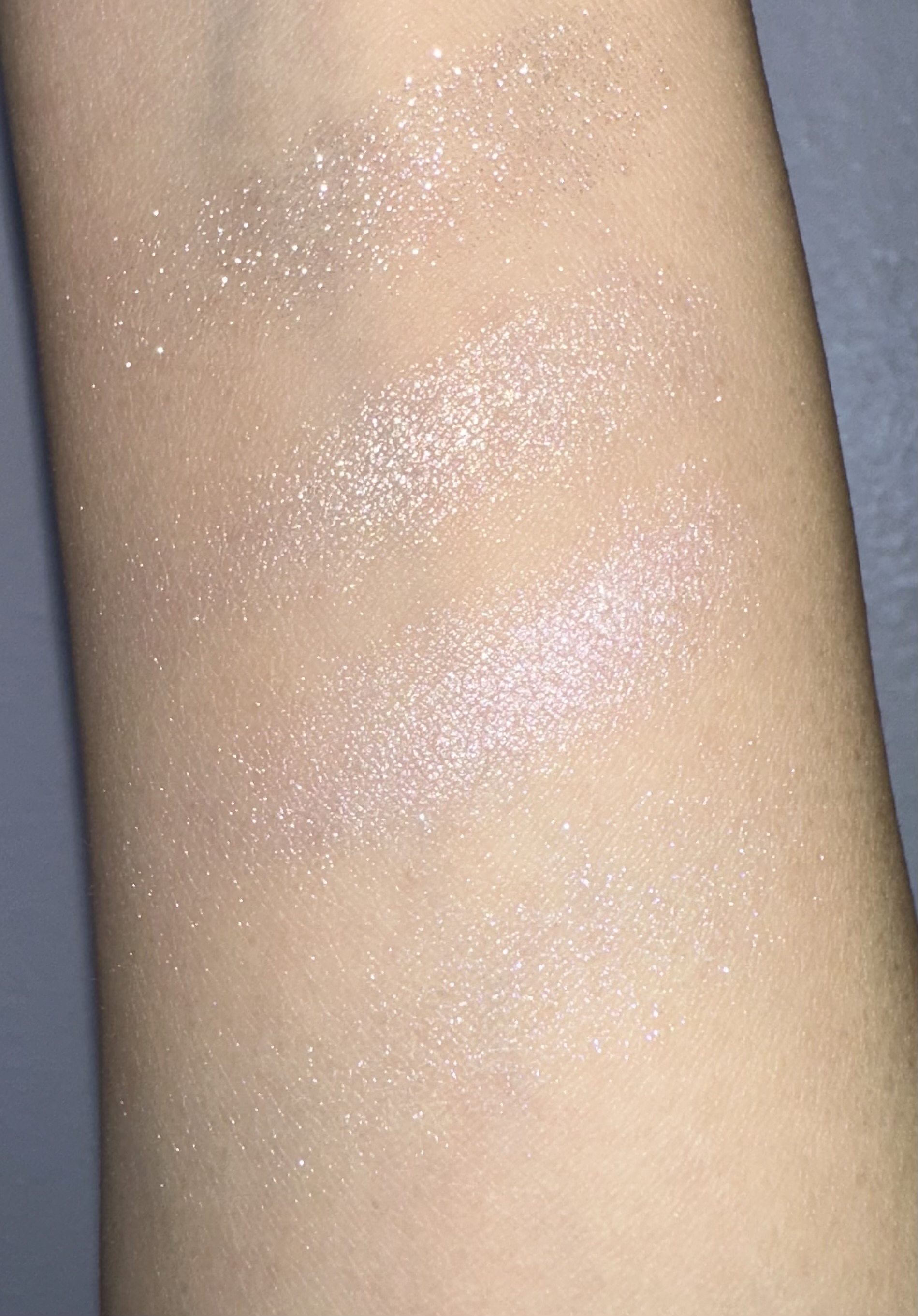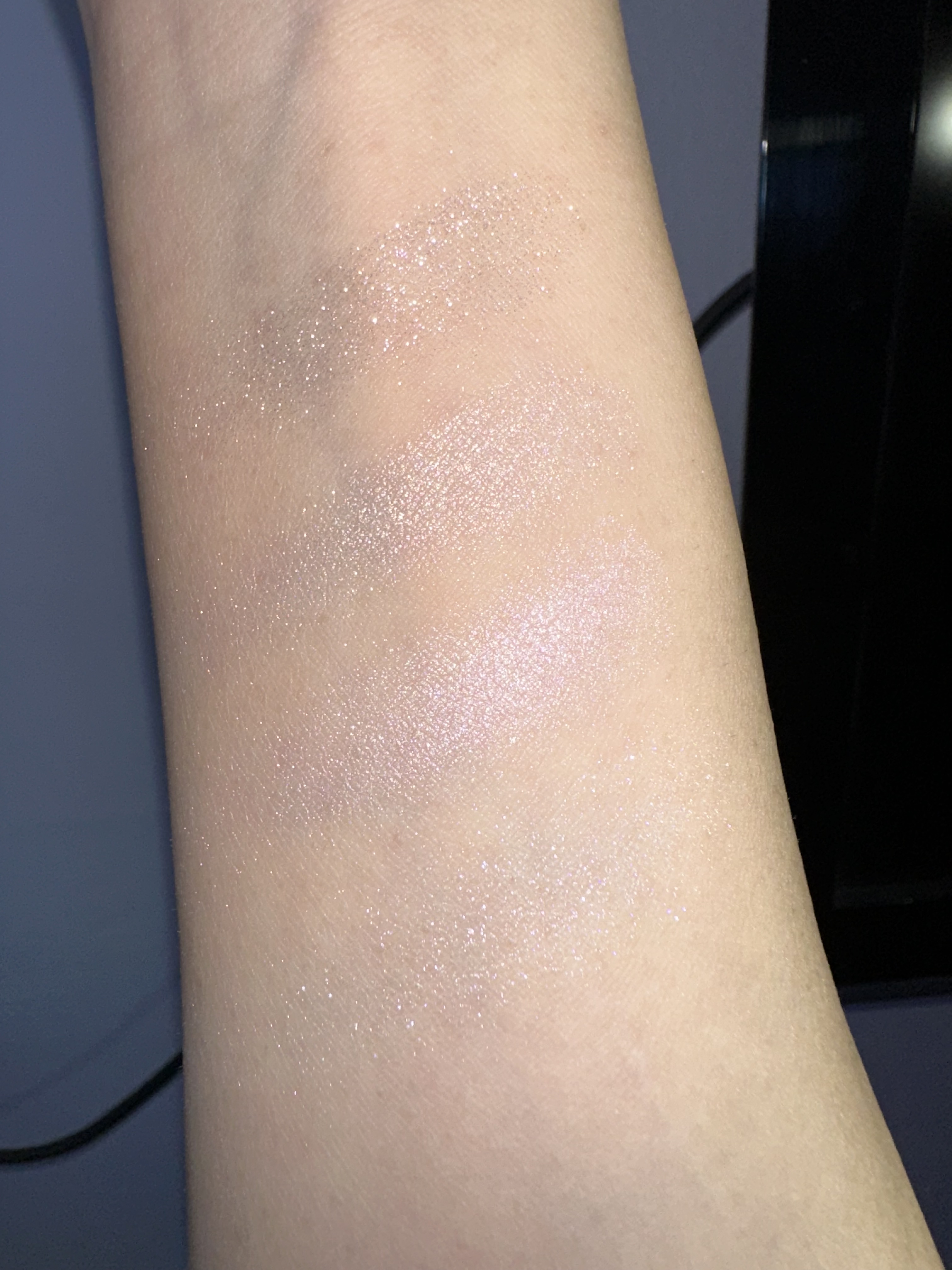 I took multiple pictures and sadly , no matter the lighting , they looked really similar. The top is the white pan and it’s a bit more of a scattered glitter ,it’s sort of a glitter bomb and really shows up on like brows and when I use it on top of my cheeks . But it definitely looks more like a body glitter than highlighter. The second is the more peachy pink, it has some gold reflect but it’s not really that different from the other pink. You can sort of see a difference on my arms but not really when worn on my cheeks.