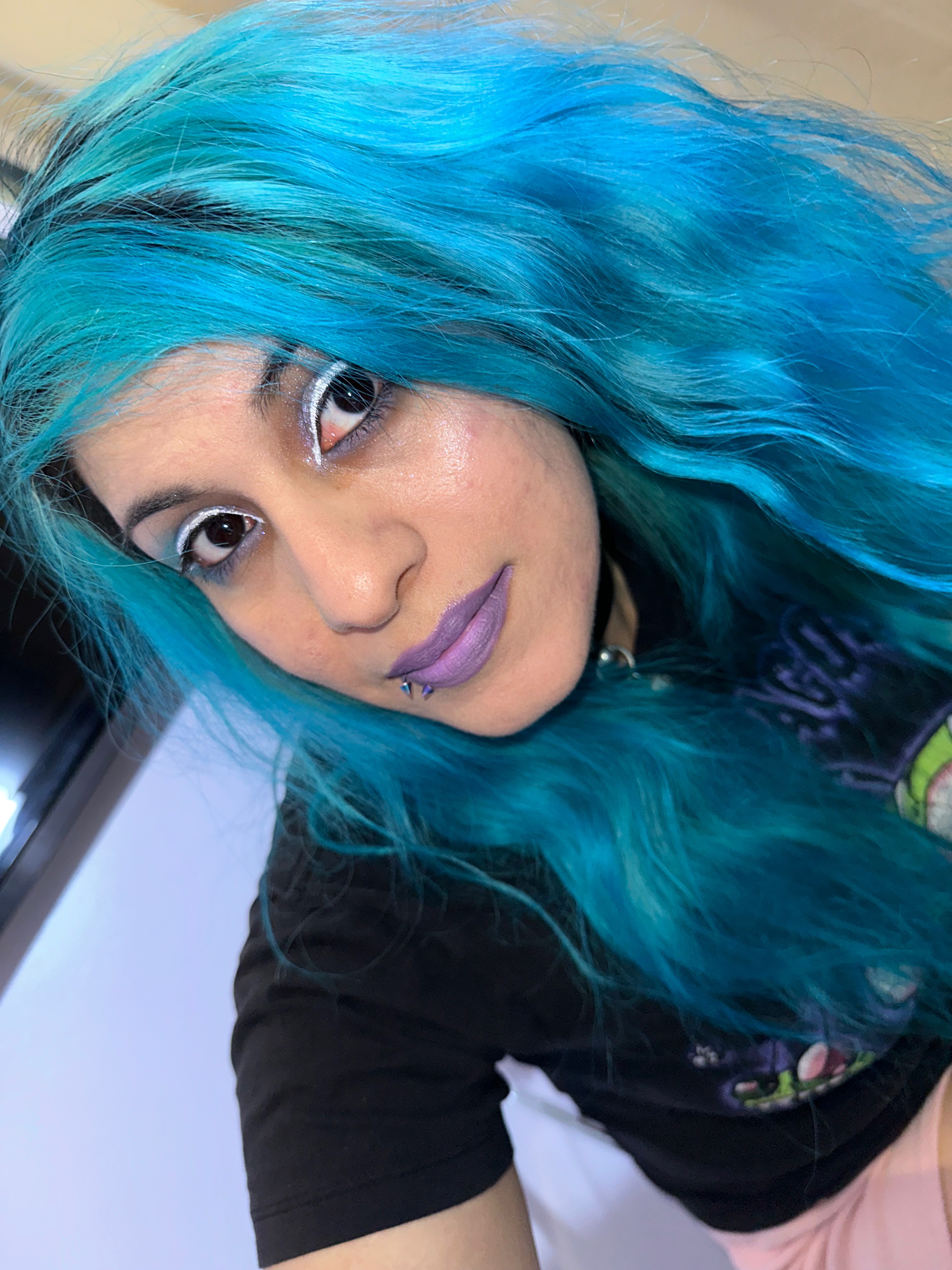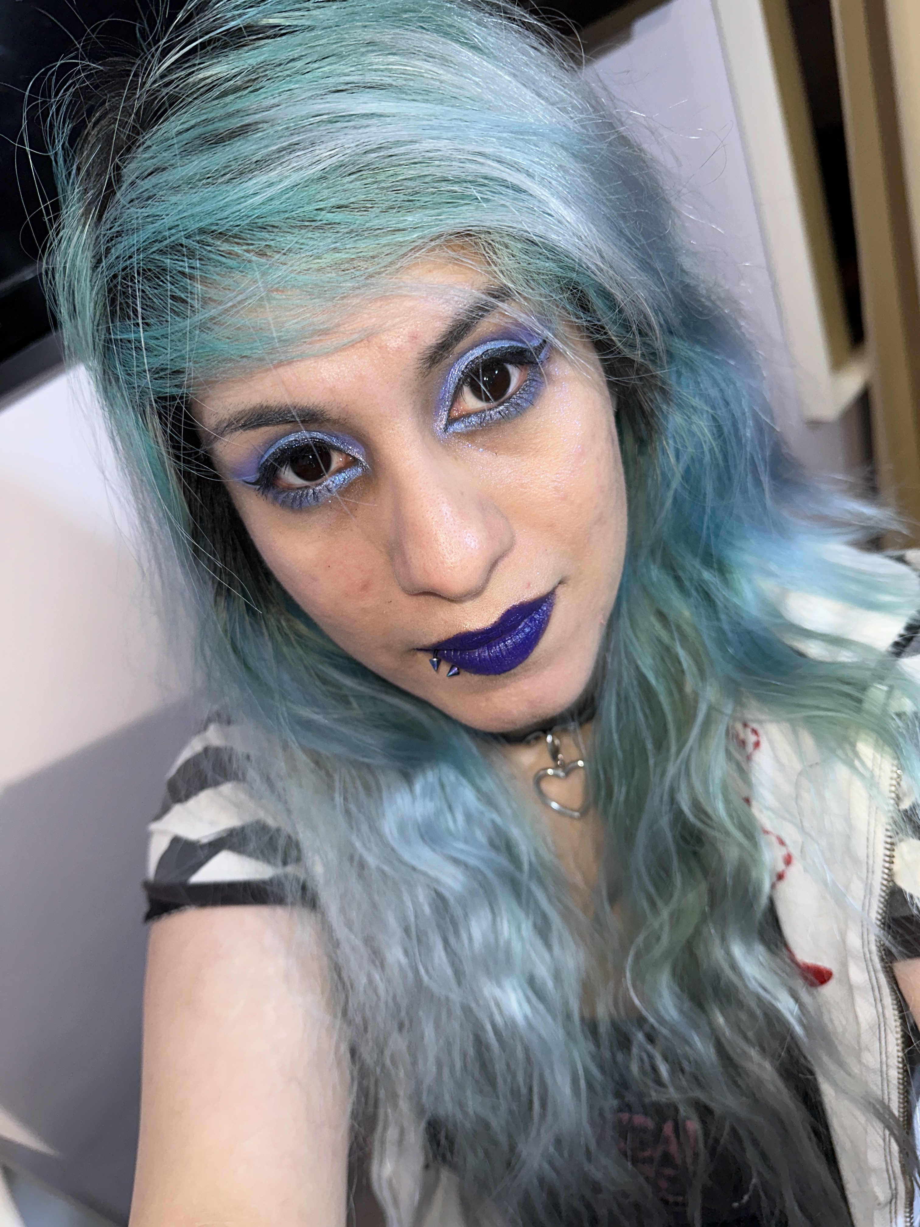 I noticed that blue also kind of relects purple too. I initially wore this look out to for a night out, I do remember having to basically layer more and more highlighter as this is one of the sheerest in the palette. Again my fan brush does not pick up this formula so I had to use a thicker angled brush and kind of swipe it over my cheeks . I wanted to love this one more than I did . It’s sheer and sparkly but I feel like if I want to go for a similar look I’ll be pulling out either my Nyx buttermelt highlight in no 1 butta or for a more otherworldly blue; venus swing. I feel like those are stronger more pigmented highligters that I honestly are easier to pick up on my brushes.