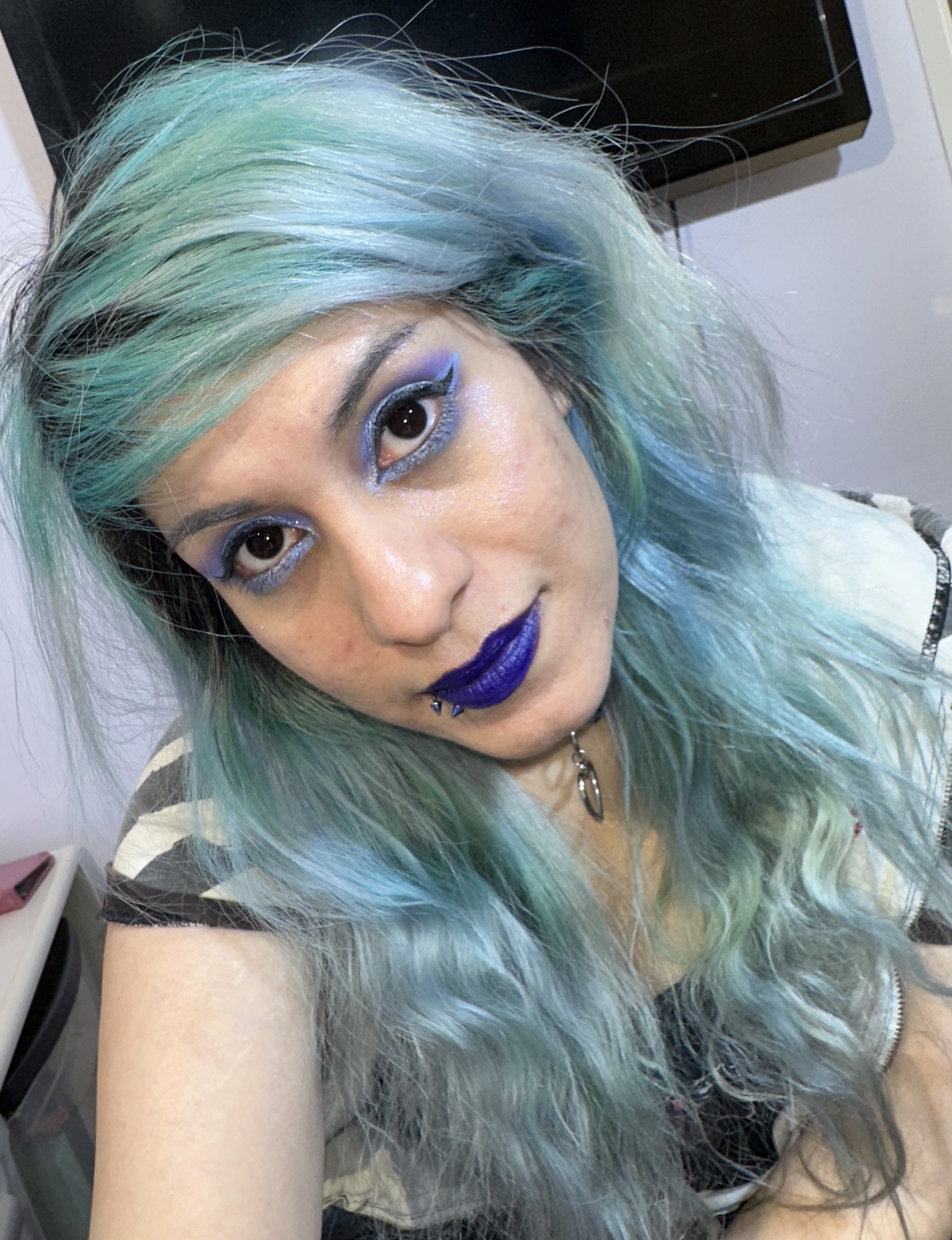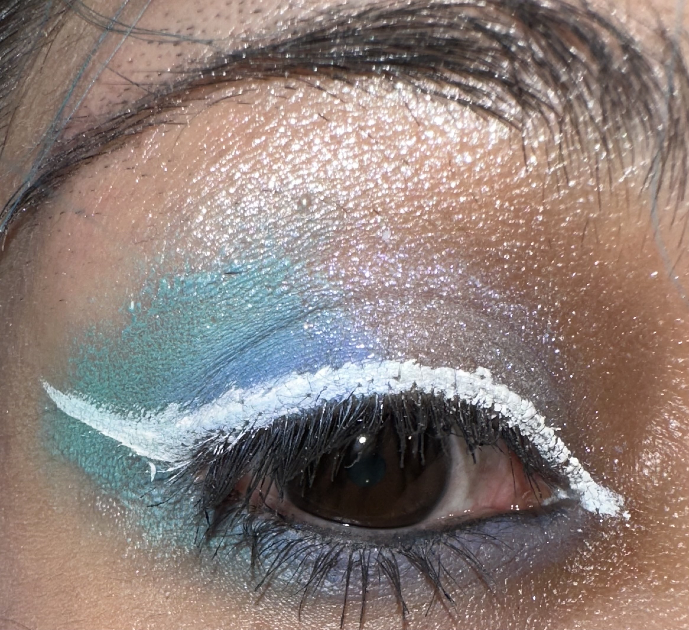 The white is honestly the shiniest in the palette , it gives kind of a wet look but is also a slioght glitter bomb . I have yet to try on my cheeks , but I’ll probably try that next in a future look . the blue is still pretty hard to work with , it’s shimmery but hard to pick up with my little brushes even when I spritz them with setting spray. I was also using glitter glue. I’m not a huge fan of the overly dry formula . The white shimmer does not have this provbably and is pretty easy to pick up with a brush .