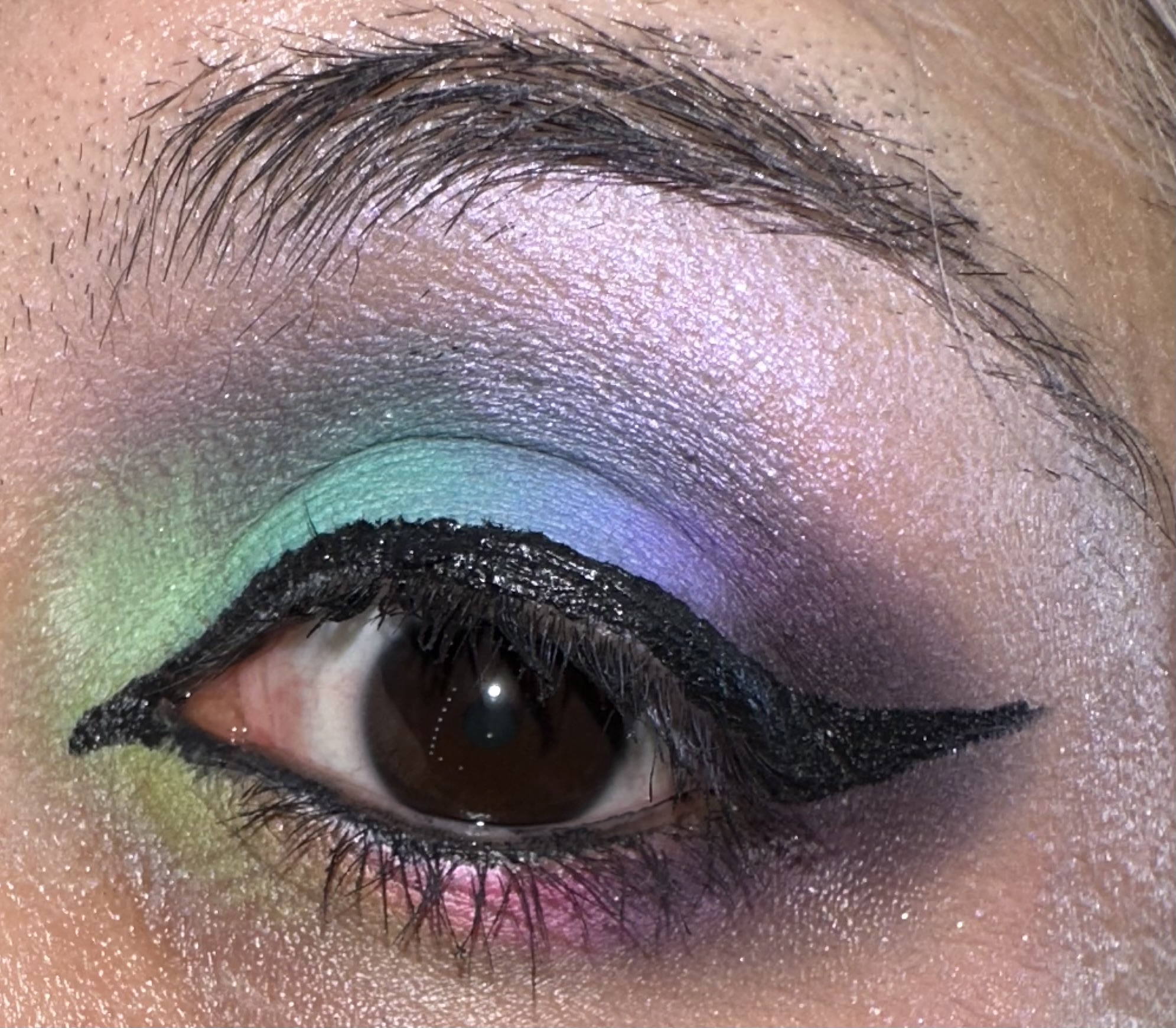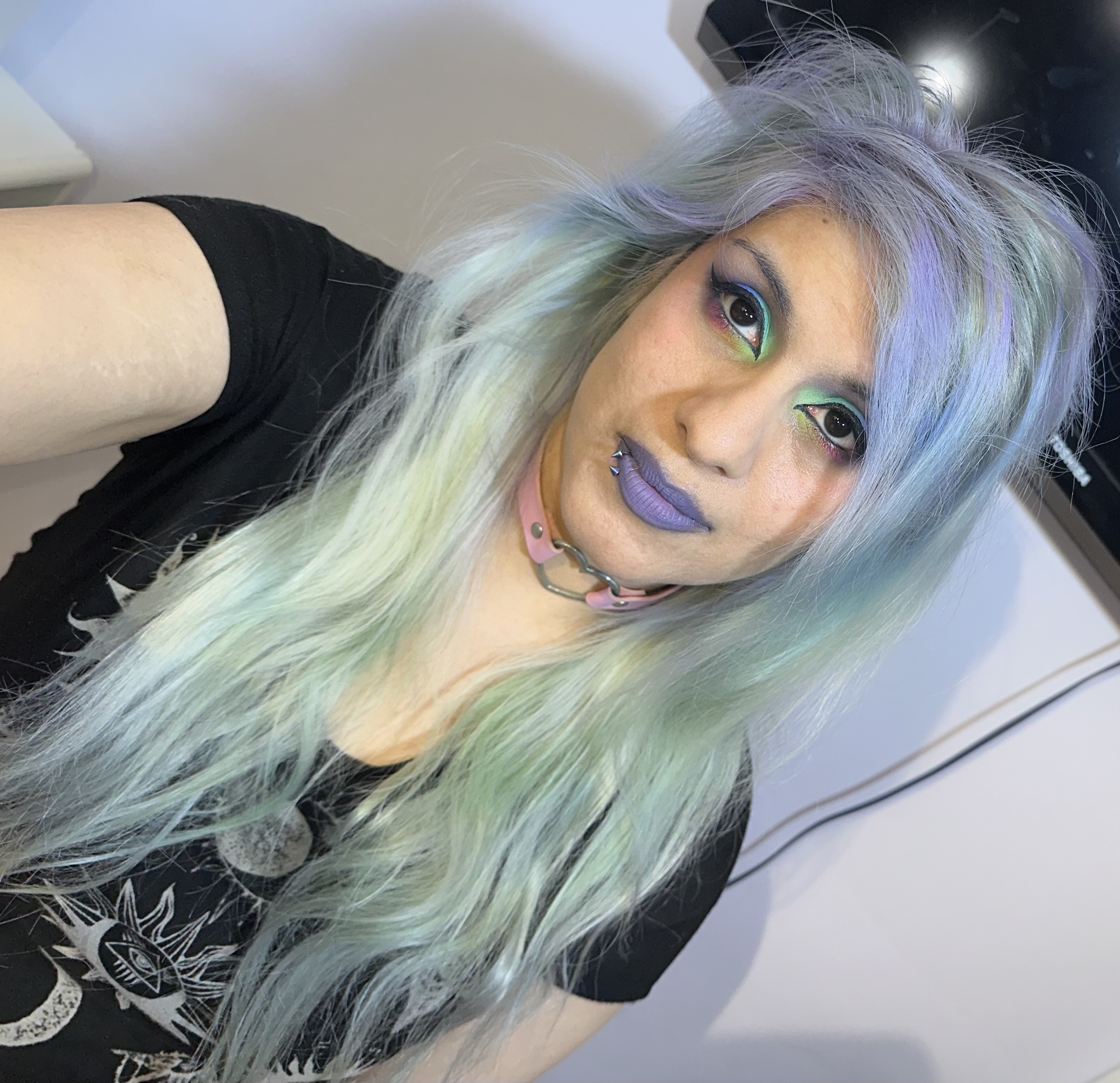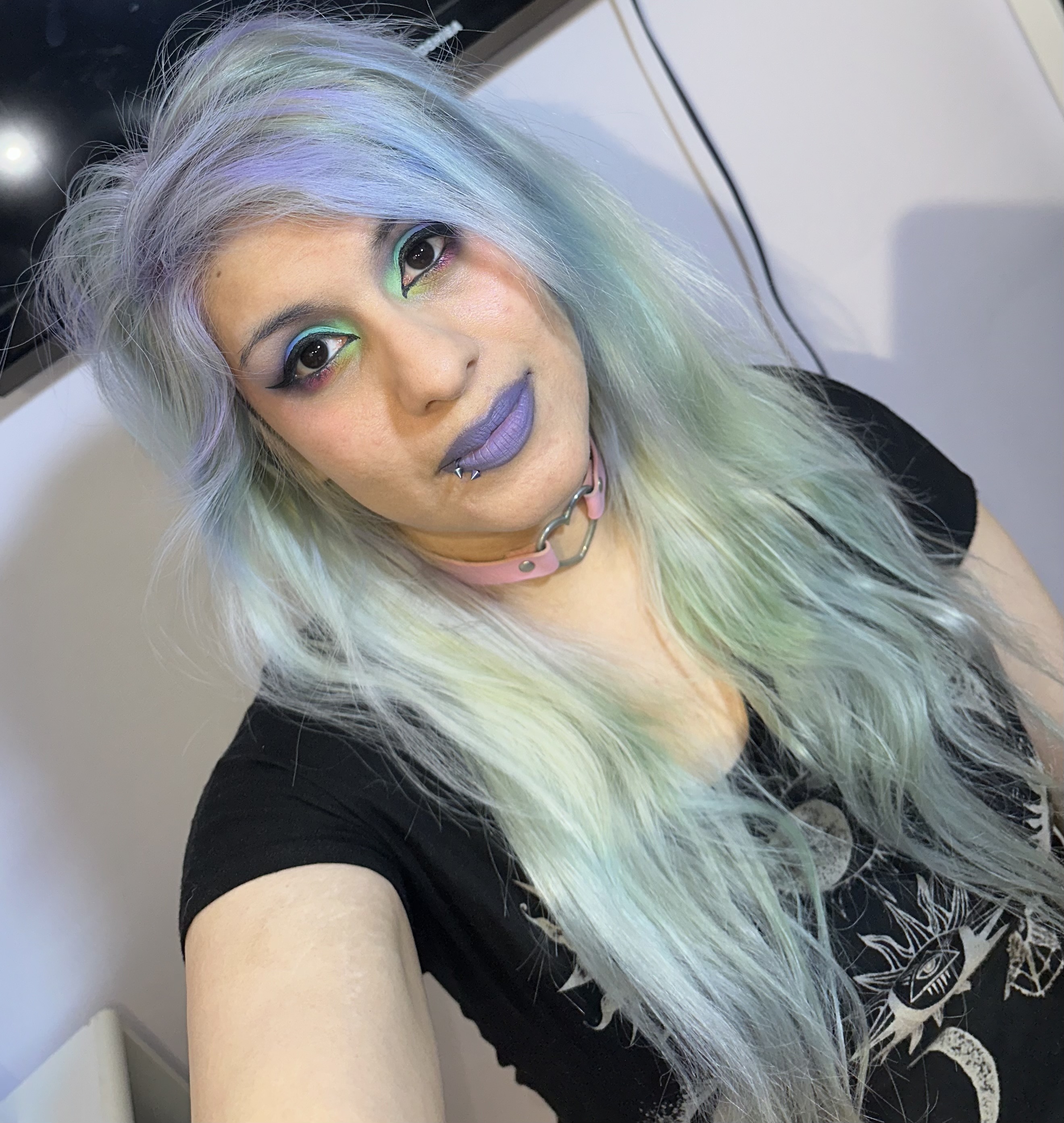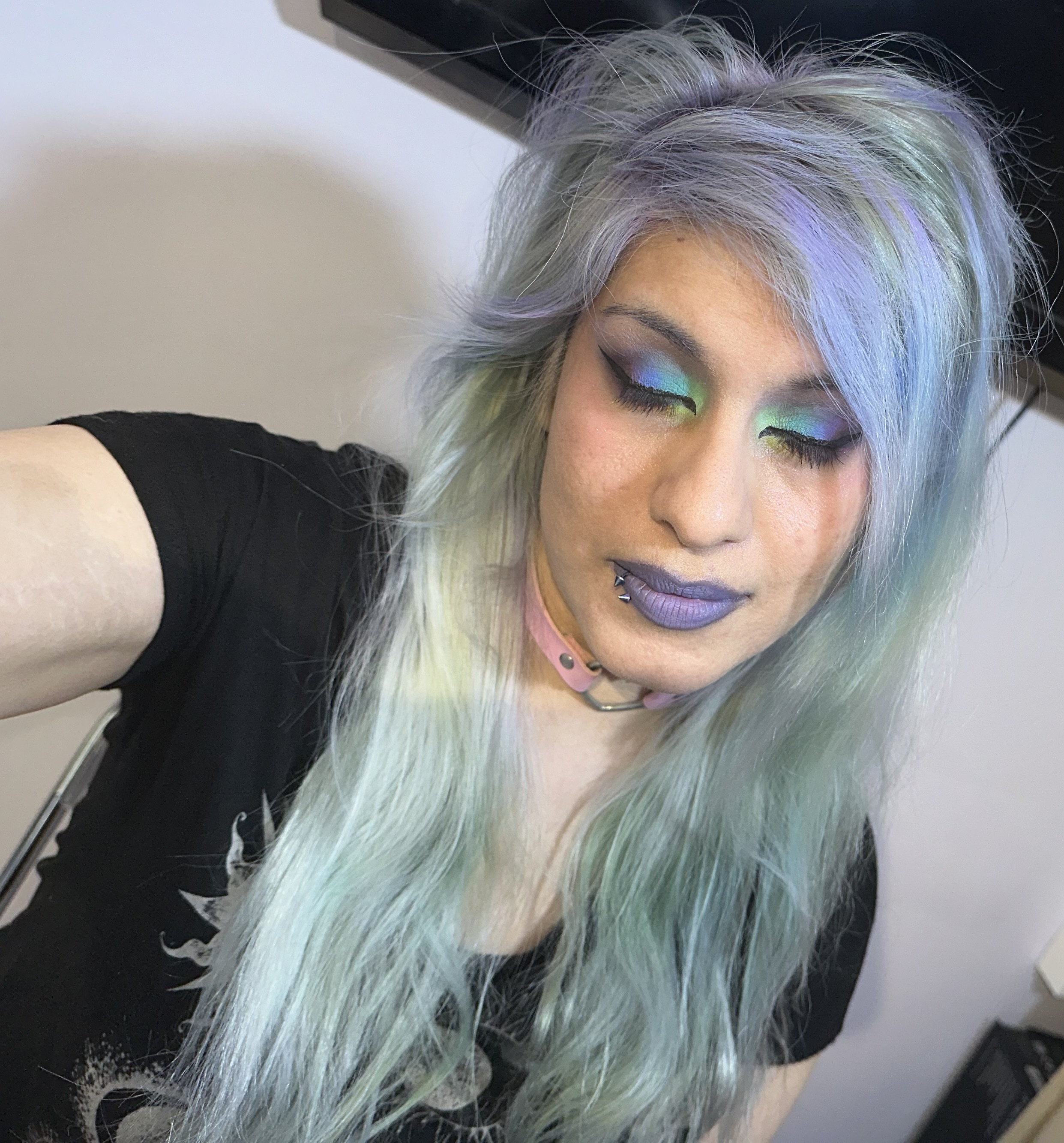 Hey everyone ! Hope you all had a wonderful Christmas ! I’ve been kind of busy but still wanted to get some posts out . I’ve had my hair platinum for pretty much the whole month , but I have to keep toning it with purple and blue hair dye tp keep it looking frosty. I bleached it at the beginning of the month , but now I think it may be time to add some more color . I’ll be showing off the new pastel shade later , but until then I’m pretty happy with my pastel violet , periwinkle and mint streaks . They were more or less a happy accident from toning my hair with extremely diluted hair dyes . And why not do some smokey pastel rainbow eyes to match too!