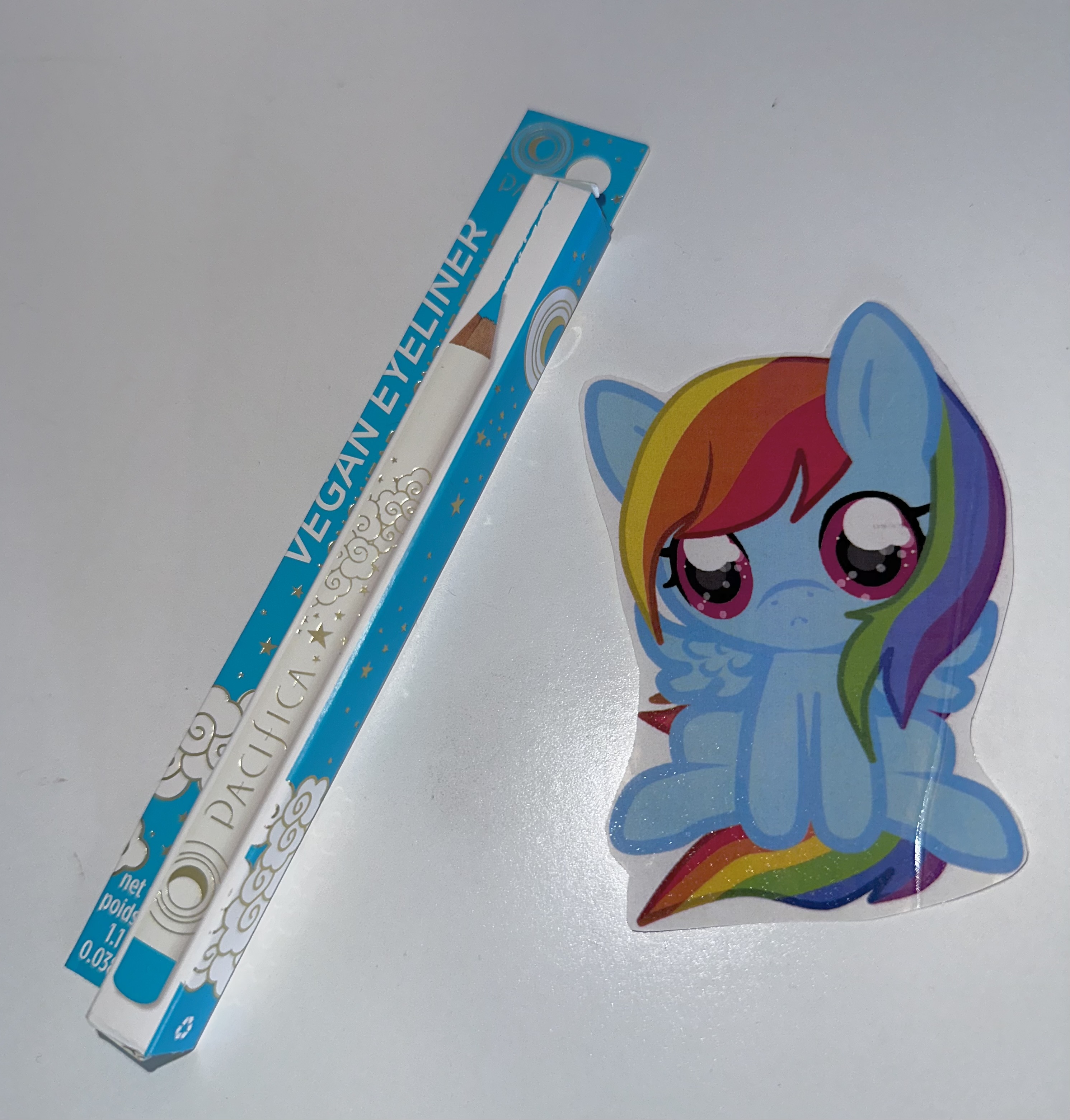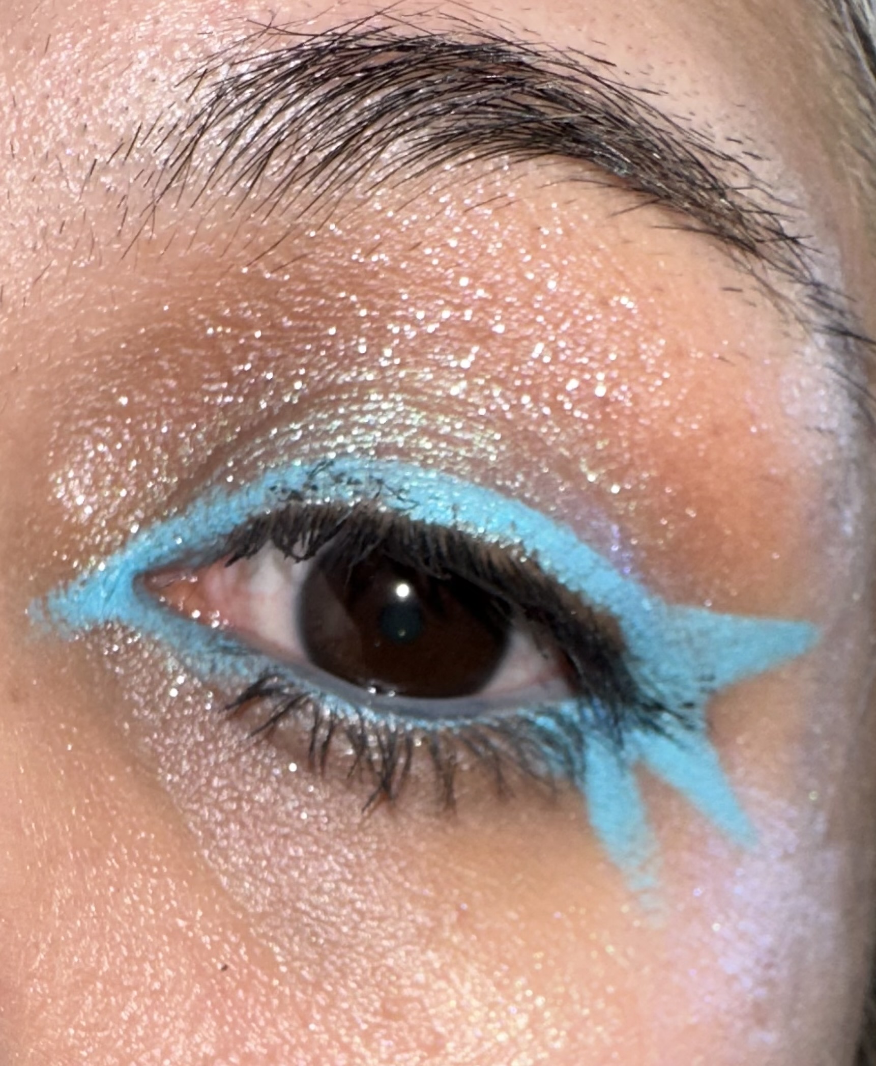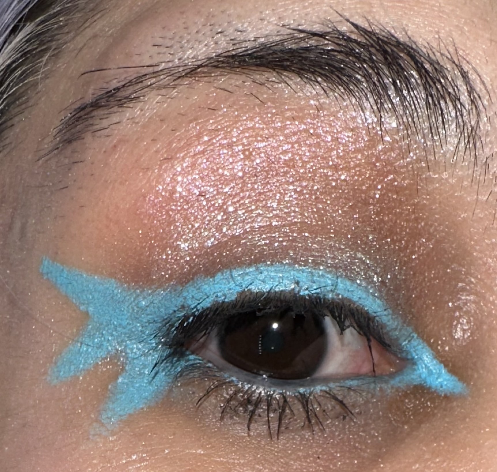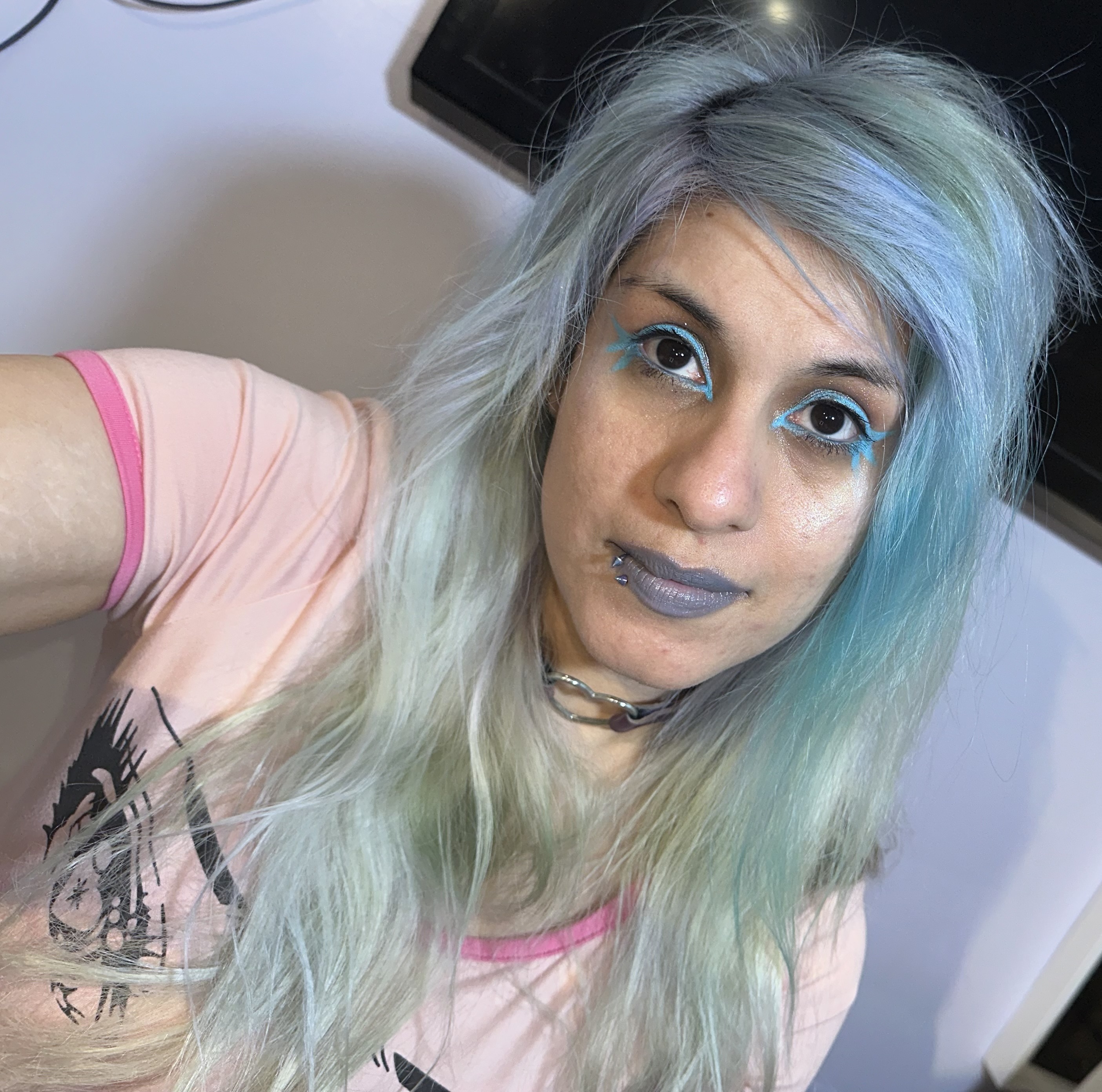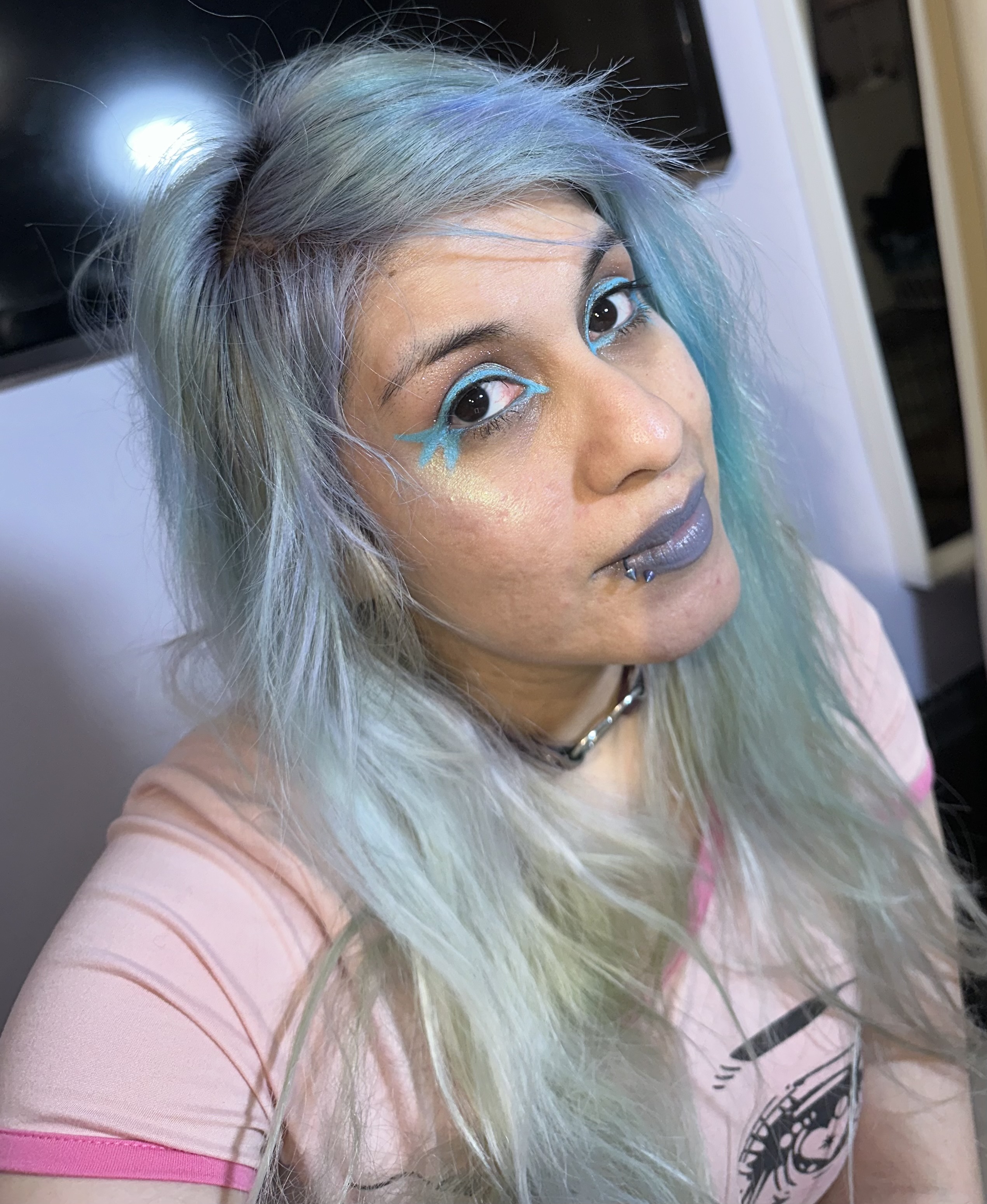 This was right before I redyed my hair . It’s mostly white and pastel blue/mint , so I wanted my makeup to match , blue, and mint highlighter.