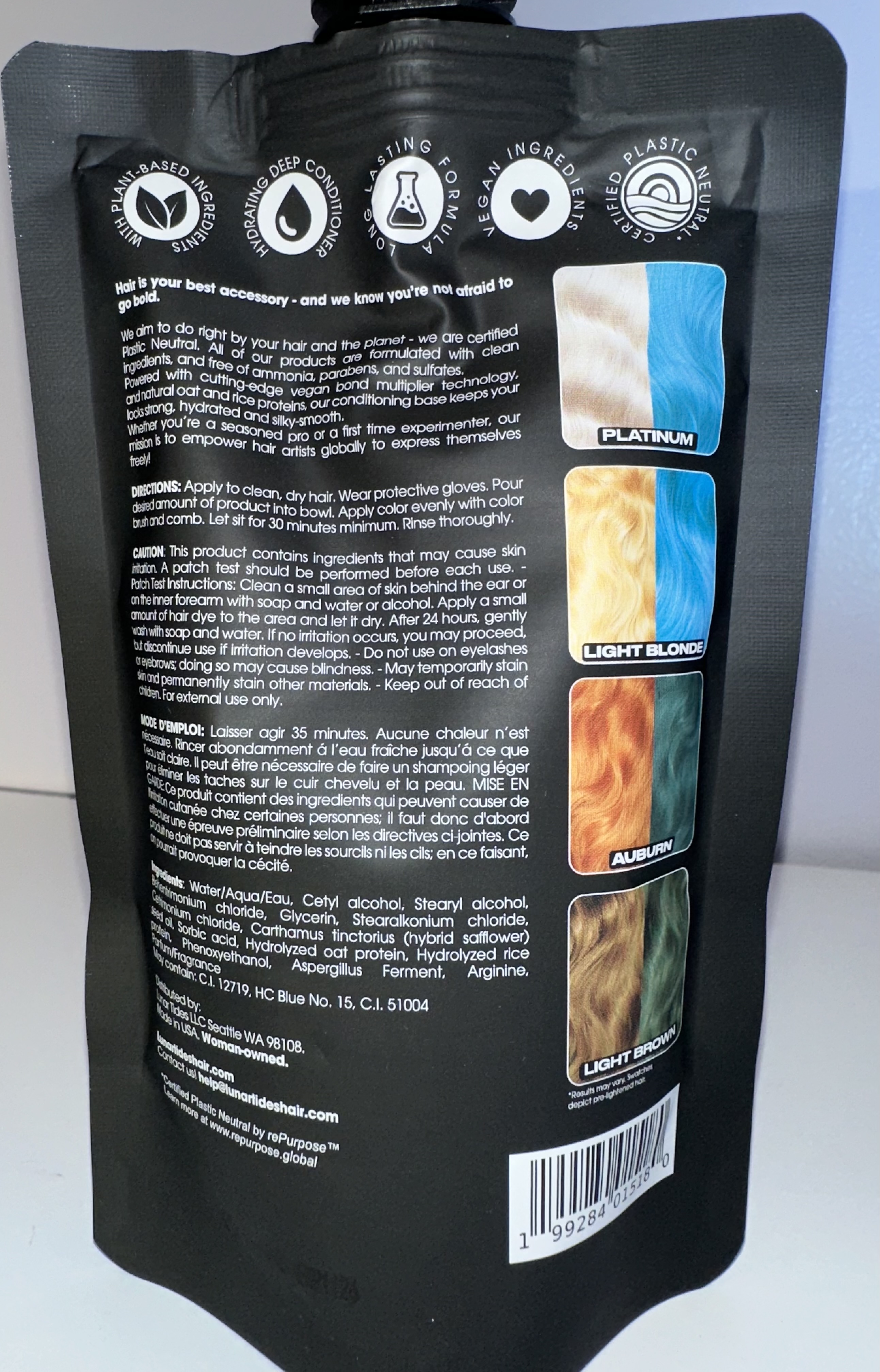 First off I did have some streaks of my hair that were a little bit of level 8 blonde and it didn’t really cover . It’s not super noticable as it’s more a small band from a previous bleach job that grew out but I’m pretty this dyde wouldn’t cover an auburn much less light brown hair . So I just want to go ahead and debunk the company’s claim right there. This is a light pastel turquoise that requires white/platinum at the least , you maybe able to get away with going over a pale inside of a banana toned blonde , but it still may have some minty green tones. But Auburn and brown I think would be impossible to cover with this shade. Also getting back to the packaging :