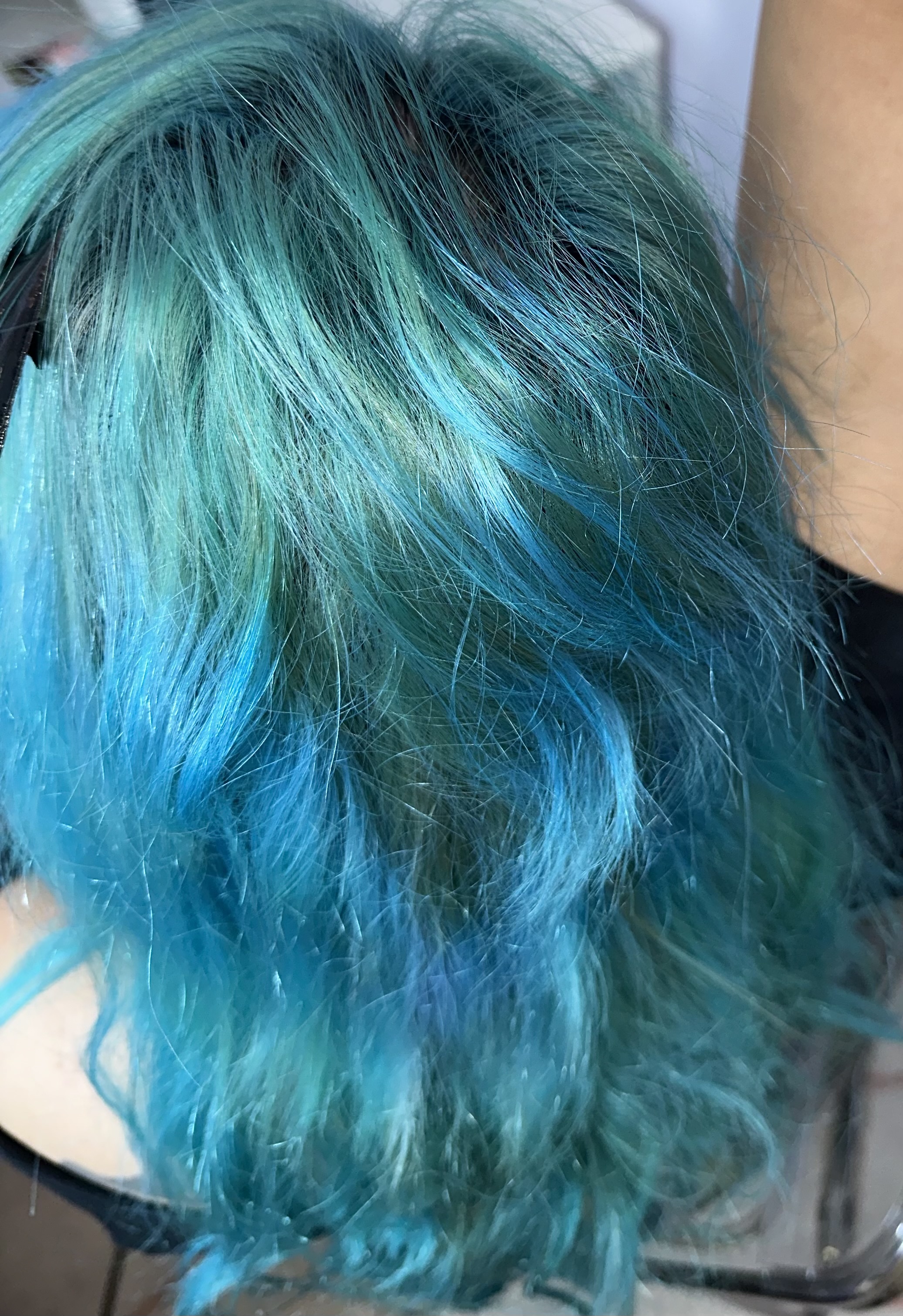 My hair was a bit messy after sleeping in braids But I was surprised to see even though parts of my hair on the top weren’t white they still came out a nice sort of Baja blast sea foam.